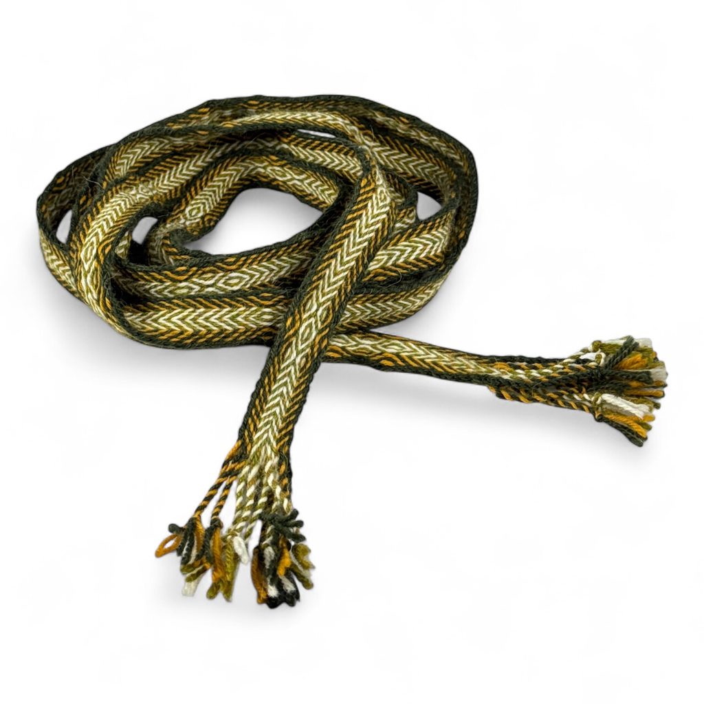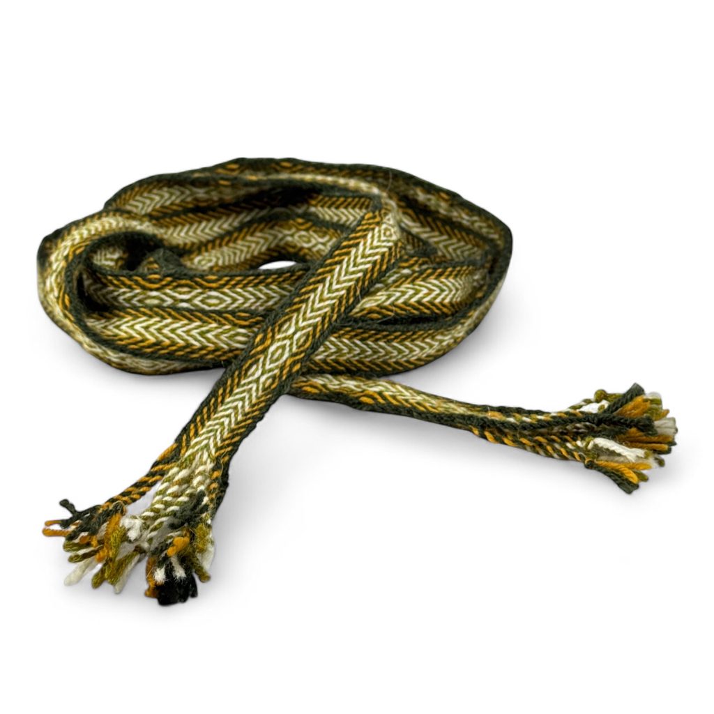 Ručně tkaný karetkový pásek, šířka cca 2cm. Karetky se používaly na ozdobení lemů oděvů, jako opasky, popruhy či na svázání vlasů nebo ovinek. Materiál: vlna. Uvedená cena je za 1 m.