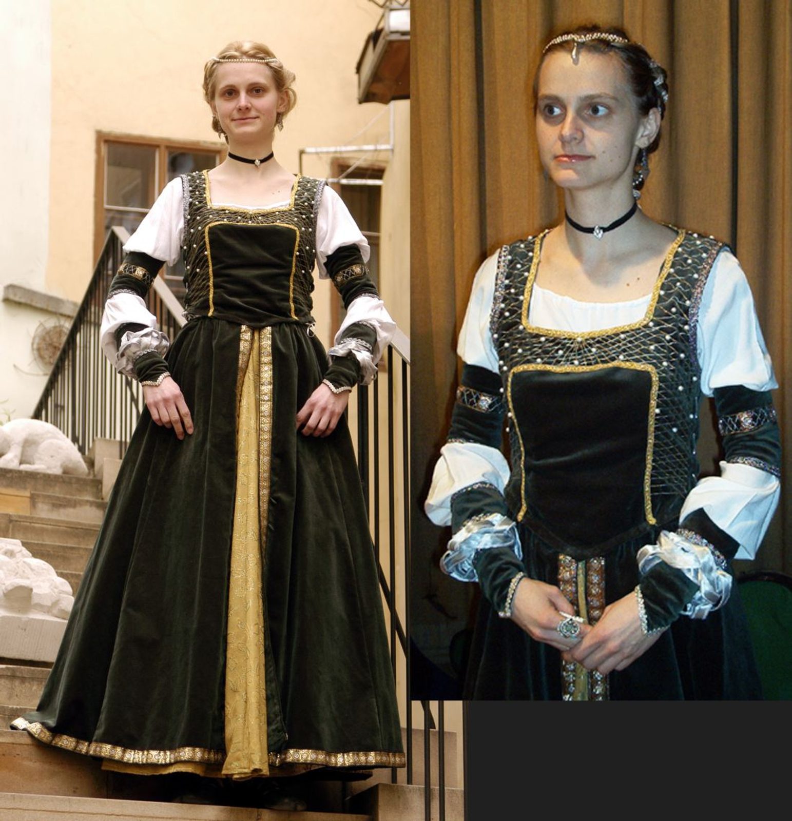 Třičtvrtěkolová sukně vpředu rozstřižená lemovaná portou,živůtek s hranatým výstřihem podšitý bavlnou, bohatě zdobený portou, výšivkou a perličkami,rukávy střídavě nabíraná bavlna a samet zdobený portou a stuhami viz. obrázek. V prostřihu sukně může být buď všitý klín z brokátu nebo je sukně bez klínu a v prostřihu je vidět spodní kolová sukně z brokátu.(objednává se zvlášť)Pod sukni je vhodná ještě spodnička, která ji dělá širší, nadýchanější.