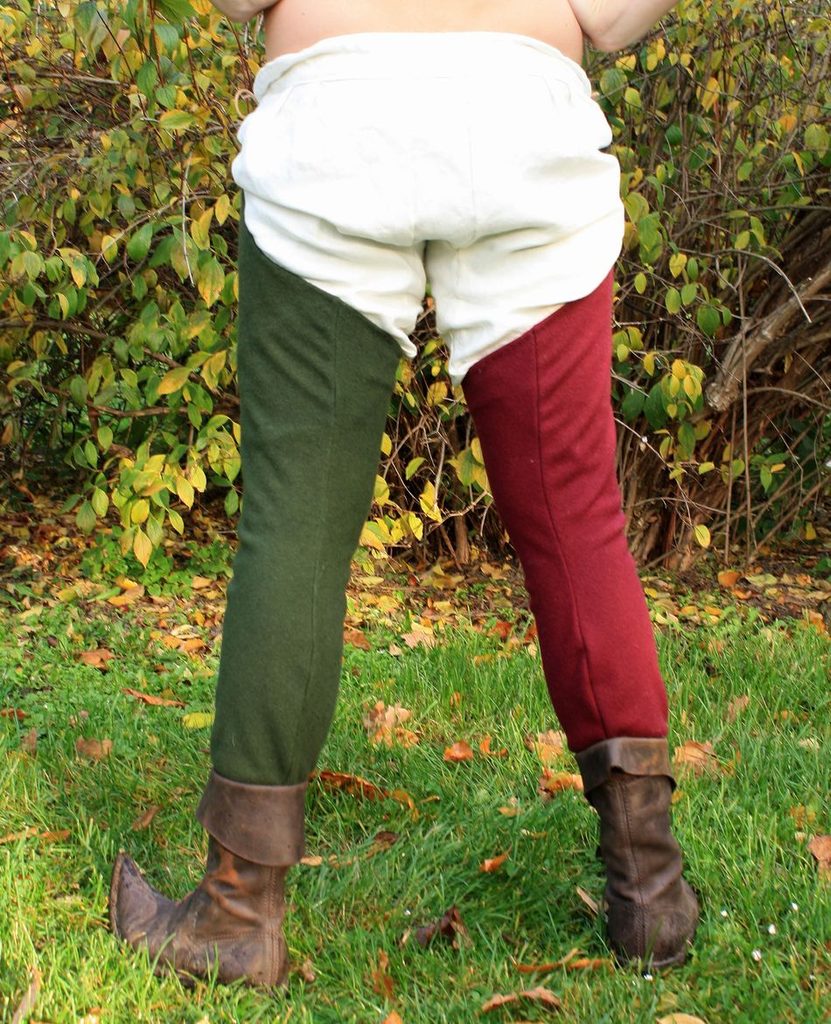 Základem každého oděvu středověkého muže jsou pořádné vlněné nohavice, které se připevňovaly na "spodky", tzv. bruchy. Naše nohavice jsou z příjemné ovčí vlny, střižené šikmo což dává nohavicím pružnost a pánům zaručuje jejich příjemné nošení.? Námi zvolená barevná kombinace je pro středověk typická zelená a červená, je však možné domluvit se i na jiných barvách.
