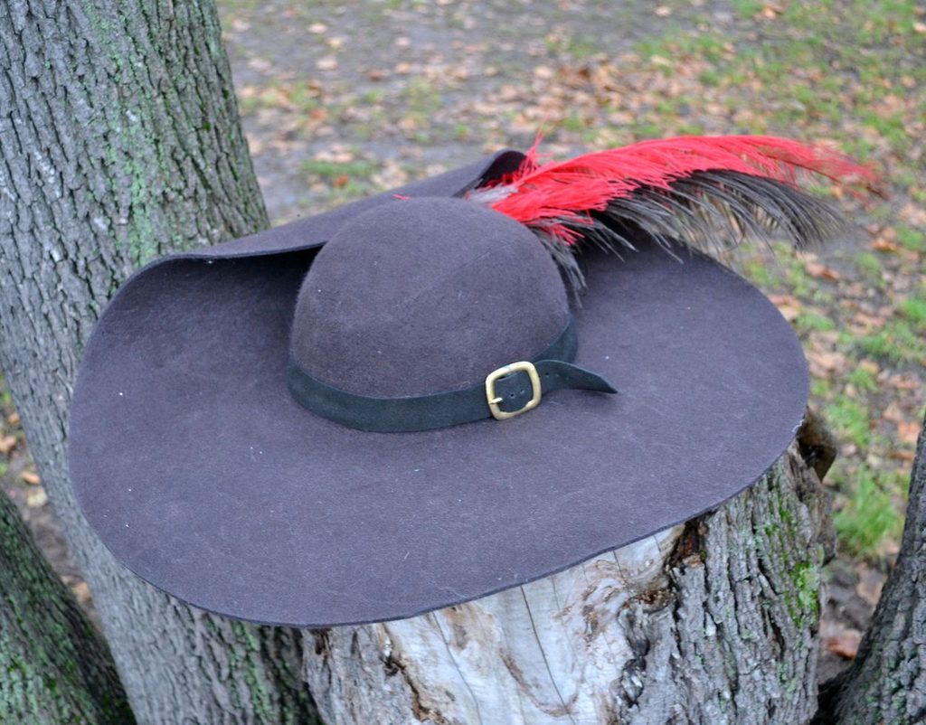 Filcový mušketýrský klobouk. Reálně se totiž kožené klobouky v 17. století příliš neužívaly.