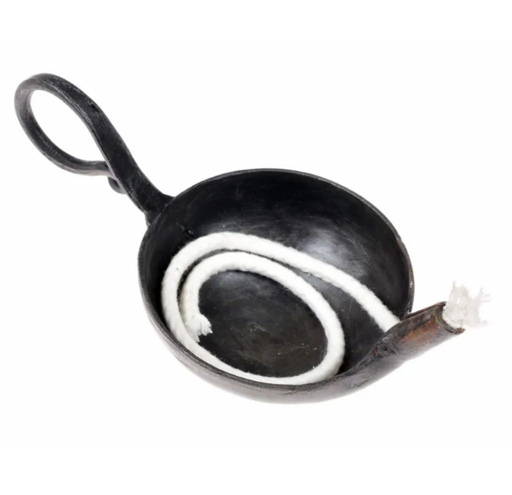 Kovaná olejová lampa ve středověkém stylu s rukojetí do očka, které zajišťuje bezpečné držení při přenášení.