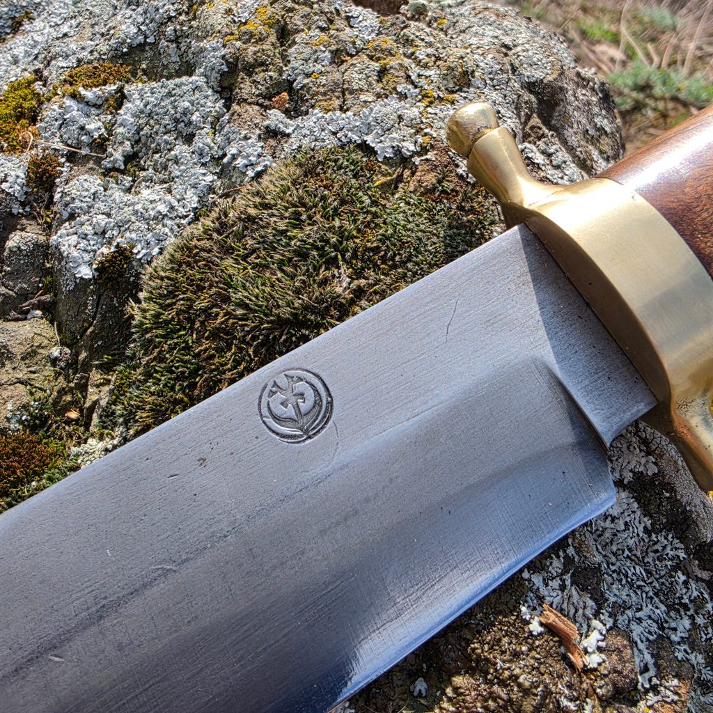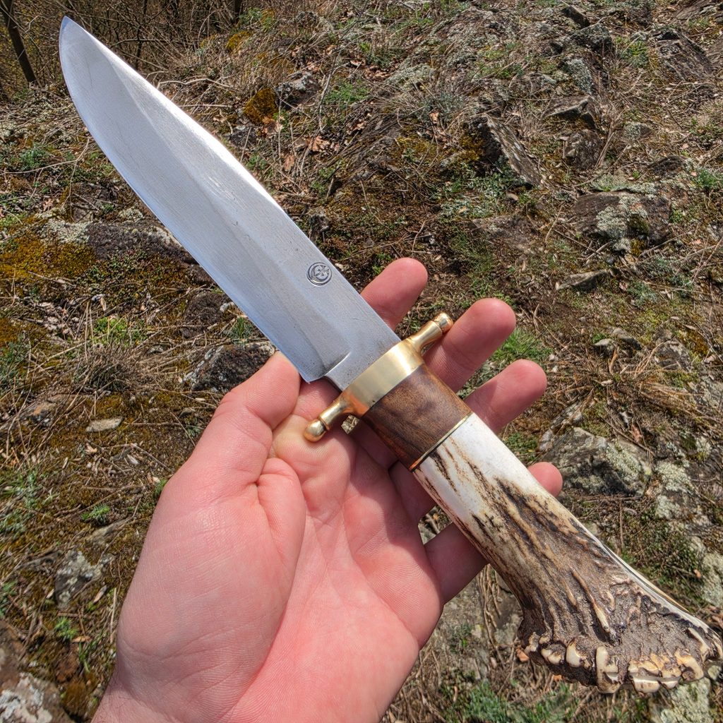 Ručně vyráběný kovaný bowie nůž s rokojetí z jeleního parohu, mosazi a ořechu. Záštita je odlévaná do mosazi. Skvěle sedne do ruky a je pádný. Může být Vaším společníkem při toulkách v lese.