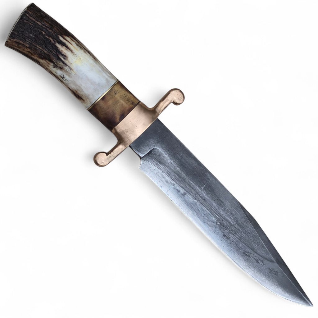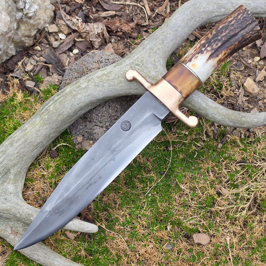 Ručně vyráběný kovaný bowie nůž s rukojetí z jeleního parohu, bronzu, mosazi a dřeva. Záštita je odlévaná do bronzu. Skvěle sedne do ruky a je pádný. Může být Vaším společníkem při toulkách v lese.
