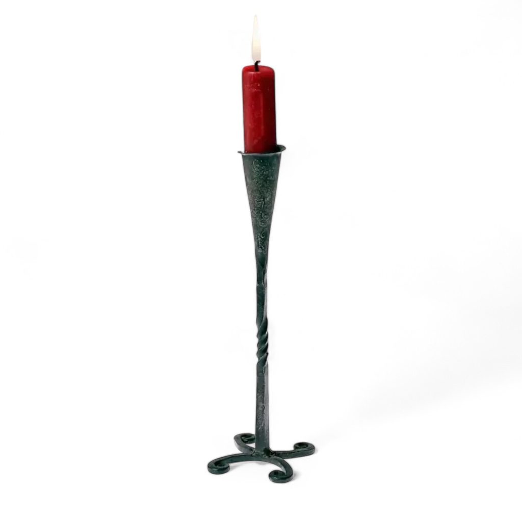 Kovaný svícen s torzí a stočenými nohami. Po staletí byly kované svícny běžné v mnoha středověkých domácnostech a poskytovaly potřebné osvětlení voskovými svíčkami.