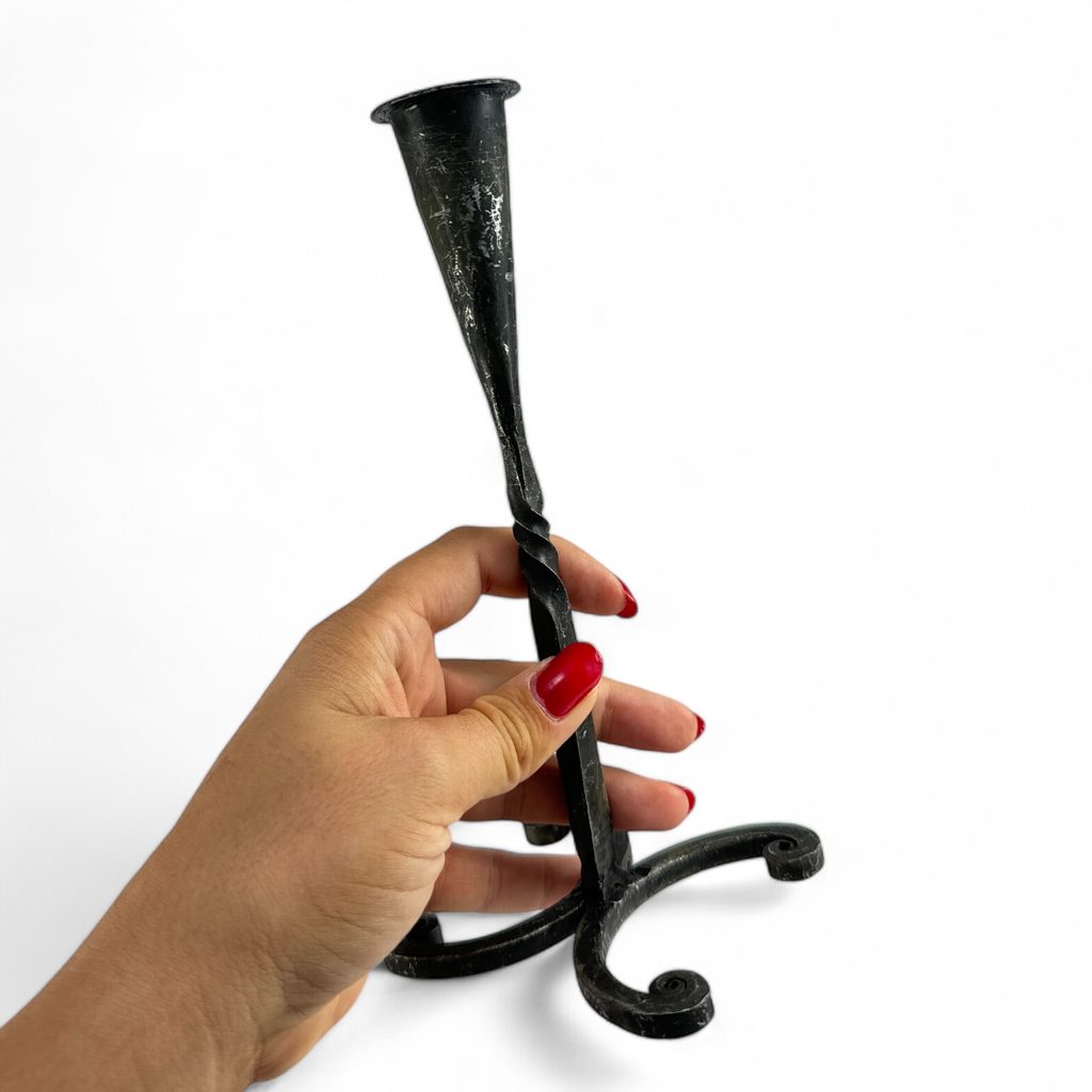 Středověký svícen je ručně kovaný a má matně černý povrch, typický pro kovářské výrobky.