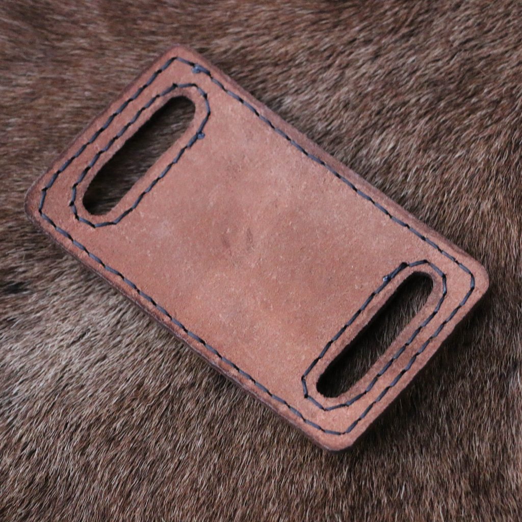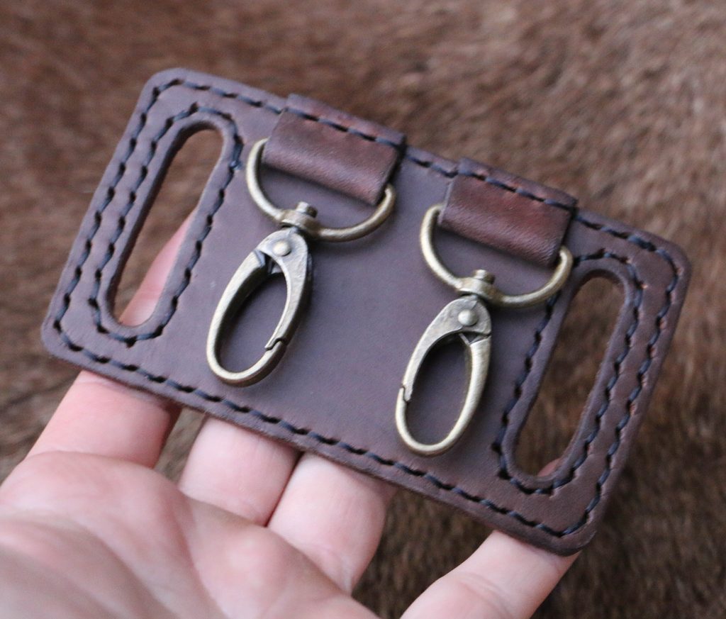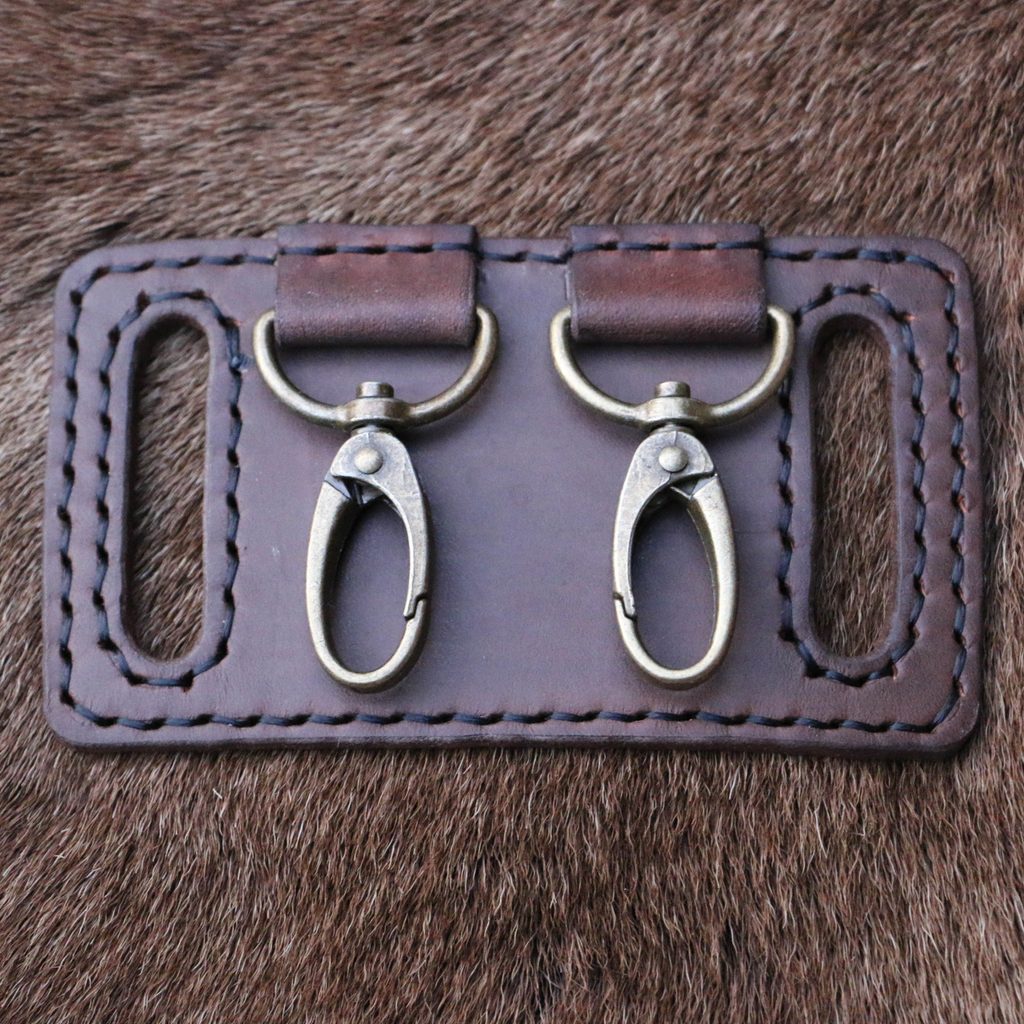 Kožený jezdec pro opasky do šíře 4cm s karabinkami pro zavěšení všeho možného včetně pracovních rukavic.