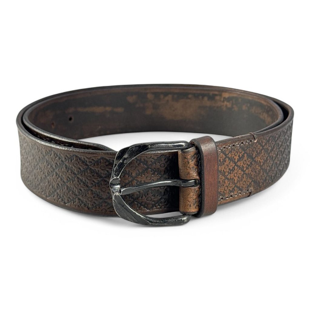 Ručně vyráběný kožený opasek s vytlačenými motivy. Opasek je vyroben zkušeným sedlářem v České republice o šíři 4 cm a je doplněn ručně kovanou železnou sponou. Síla kůže je 4 mm, což z opasku činí módní a praktický doplněk, který Vám bude sloužit dlouhá léta.