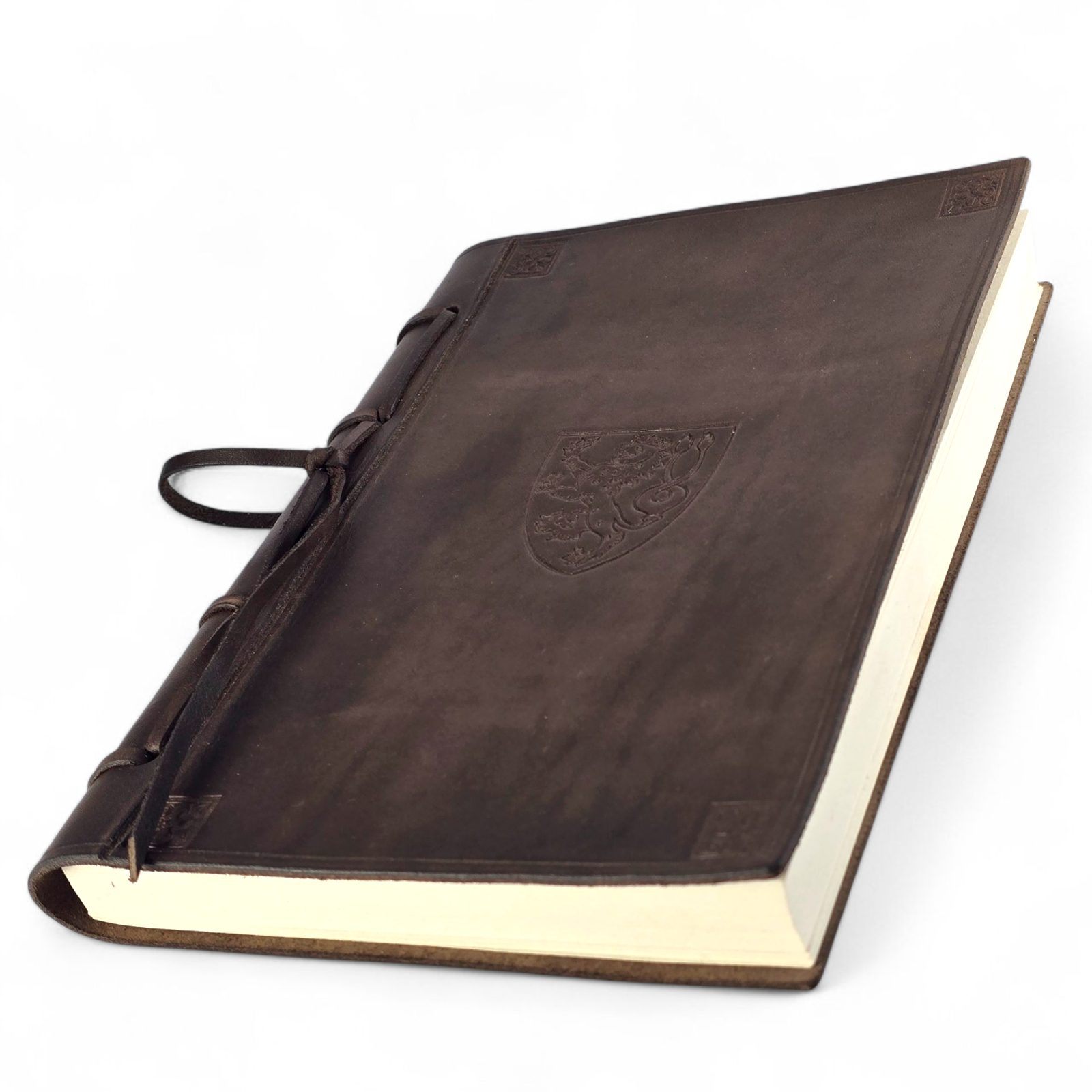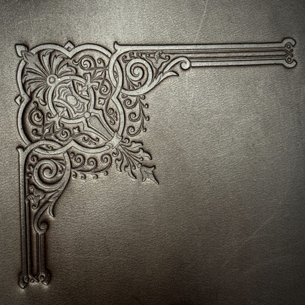 Vyrábíme jej na přání zákazníka - lze si zvolit styl zdobení rohů koženého přebalu, barvu i možnost ozdobení středu knihy - monogram či jiný znak.