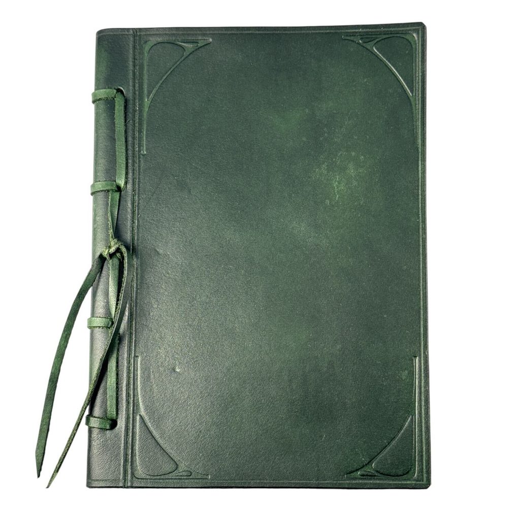 Zápisník s ručně vyráběným zdobeným koženým přebalem.