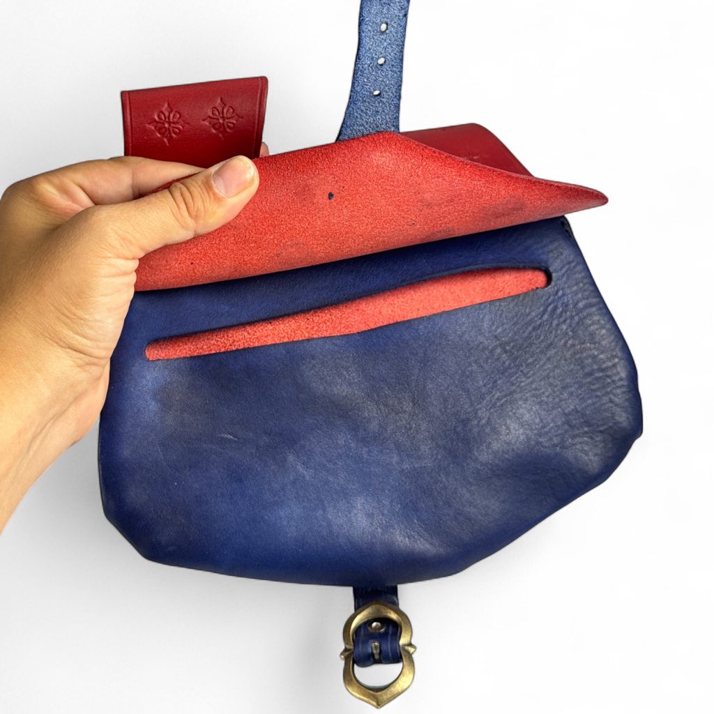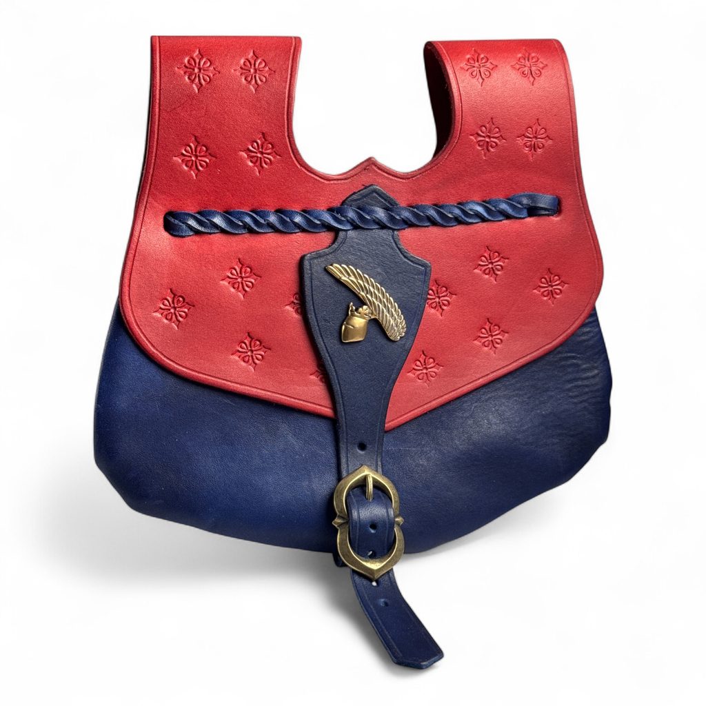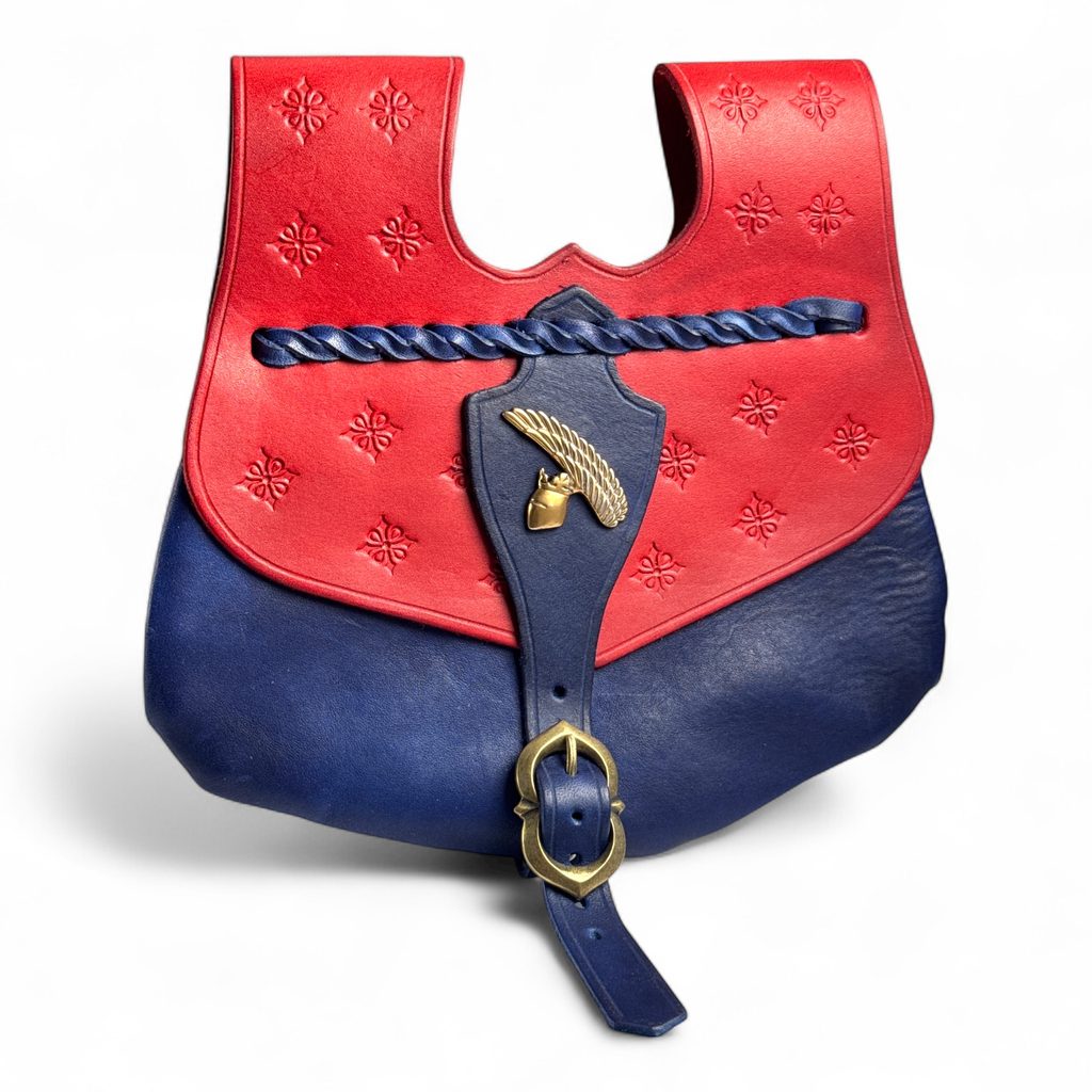 Ručně vyrobená kožená středověká brašna s bronzovým zpodobněním Krále železného a zlatého - Přemysla Otakara II. Vnitřní systém obsahuje dvě úložné vrstvy. Ruční malování. Ozdobeno bronzovým přívěškem turnajové přilby s klenotem ze supích per. Podoba šperku je převzata z Gelnhausenova kodexu.