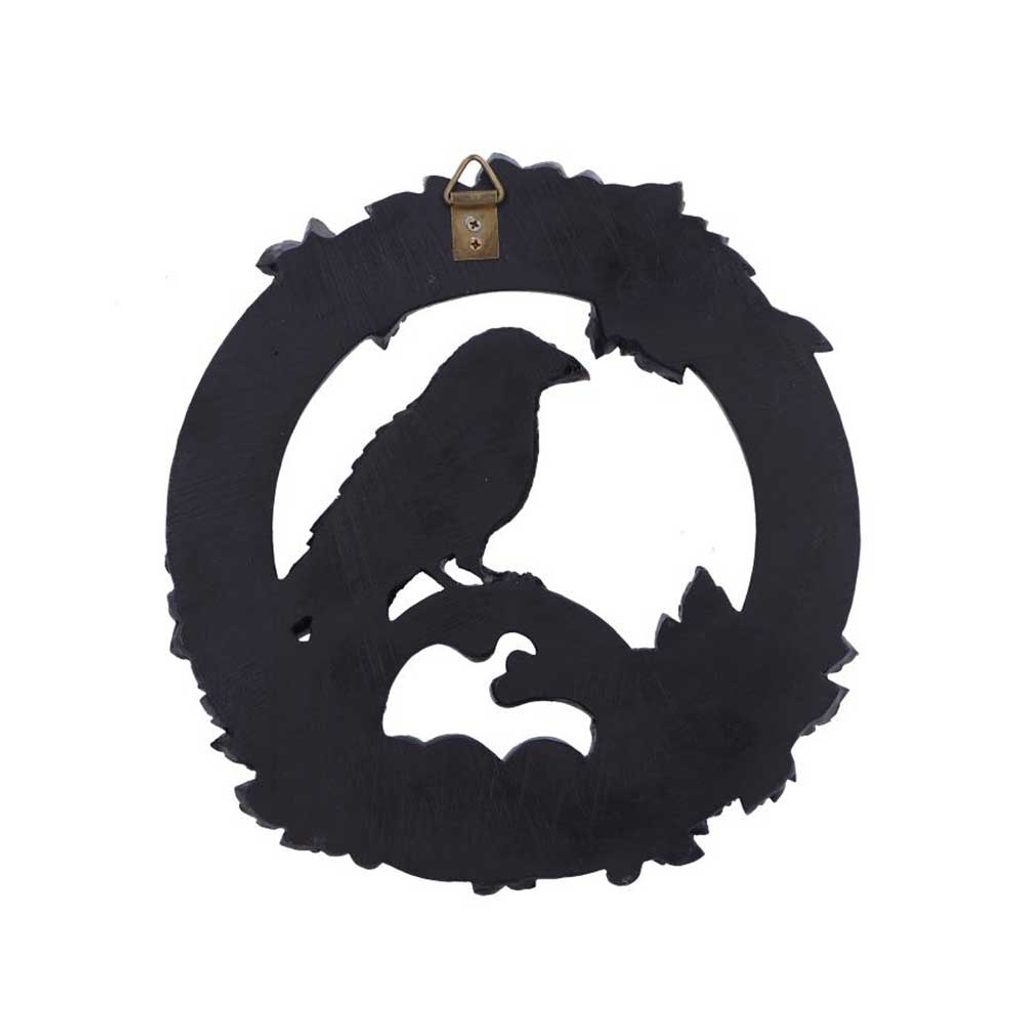 Dekorace je vyrobena z kvalitní pryskyřice (polyresin) a ručně malována, díky čemuž vynikají jemné detaily peří i reliéfní prvky rámu. Je vhodnou ozdobou pro interiéry s temnou, mystickou nebo přírodní atmosférou, ale také jako originální doplněk do pracovny, knihovny či rituálního prostoru.