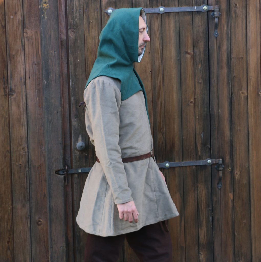 Jednoduchá středověká kapuce. Materiál dyftýn se lněnou podšívkou. Lze vyrobit i z vlny.