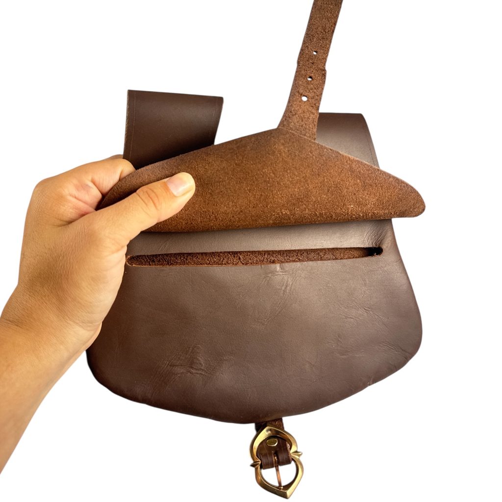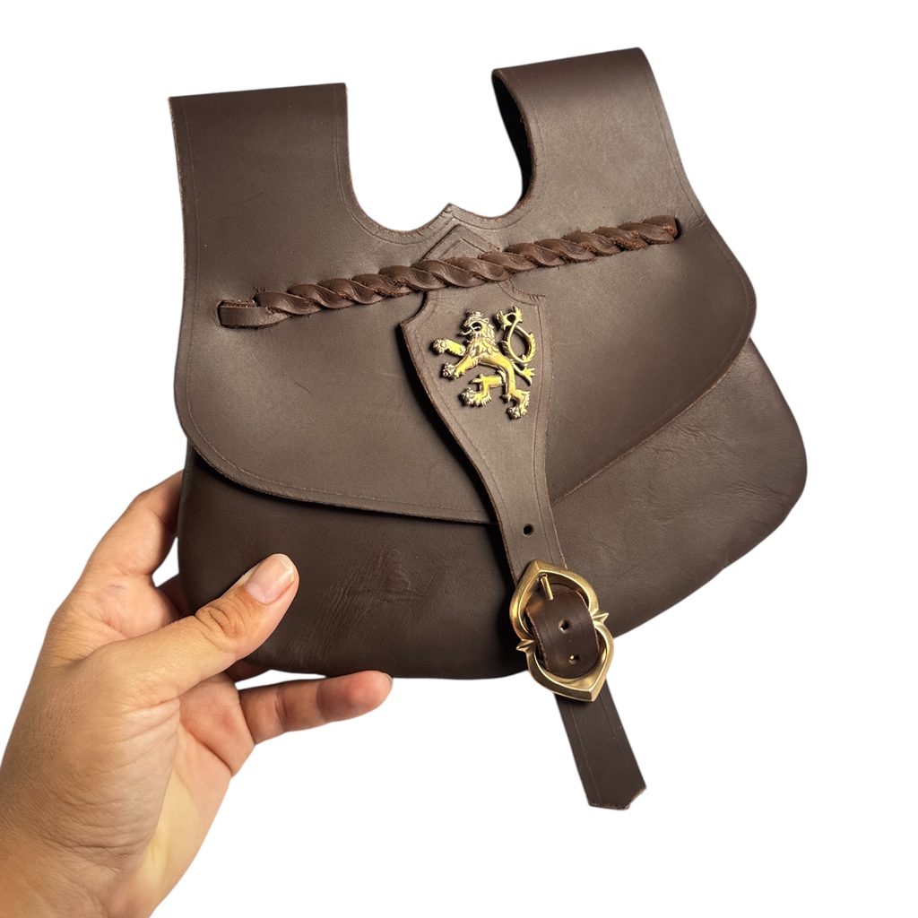 Ručně vyrobená kožená středověká brašna s bronzovým zpodobněním českého lva. Velikost: 18.5 x 20 cm.