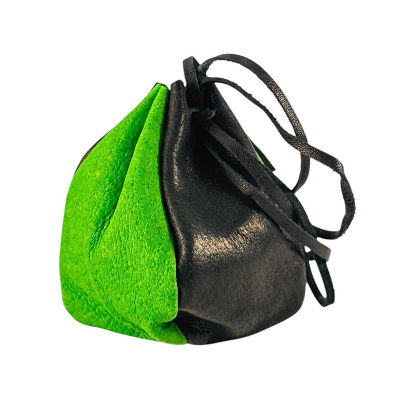 Kožený měšec ručně vyrobený z kvalitní hovězí kůže. Kombinace černé a výrazně zelené kůže zaručuje jedinečný vzhled – ideální pro kostýmové akce, historické festivaly, LARP či každodenní nošení drobných předmětů. Zavazování pomocí kožené šňůrky.