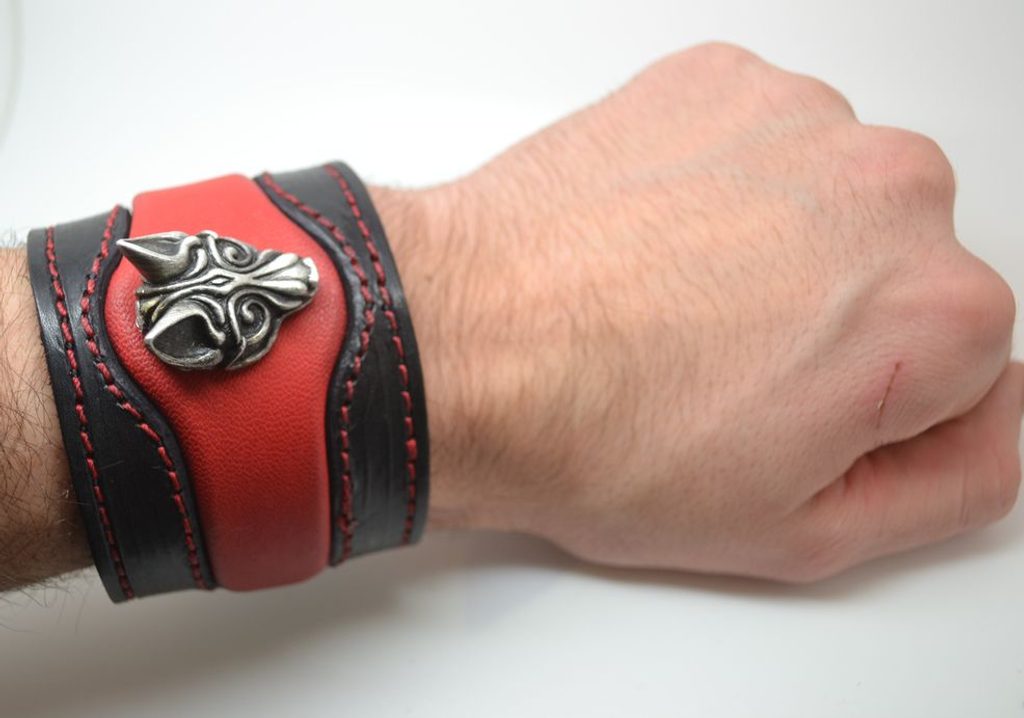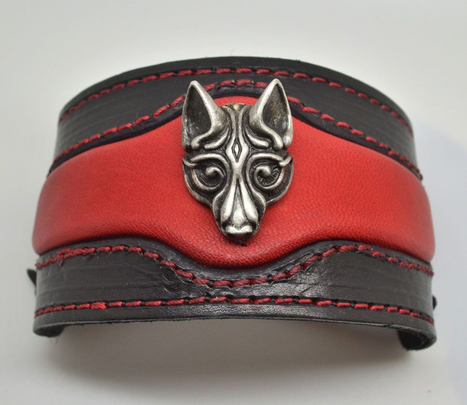Designový kožený náramek s hlavou vlka (postříbřená slitina cínu). Velikost: 5.5 x 15 cm.