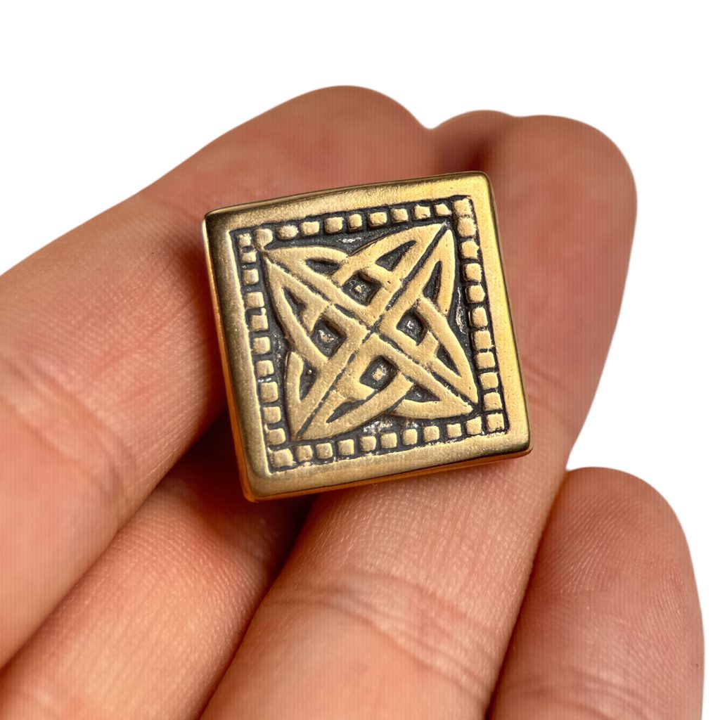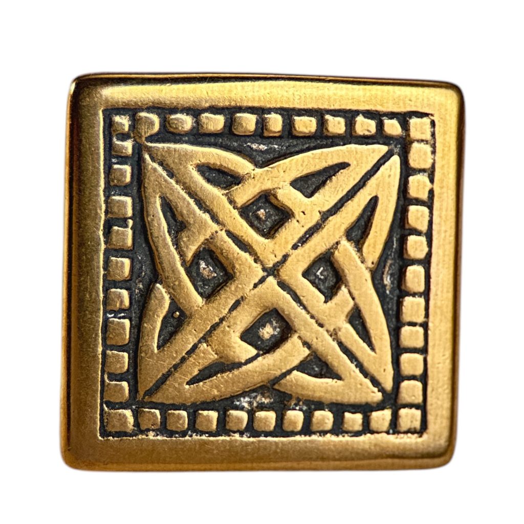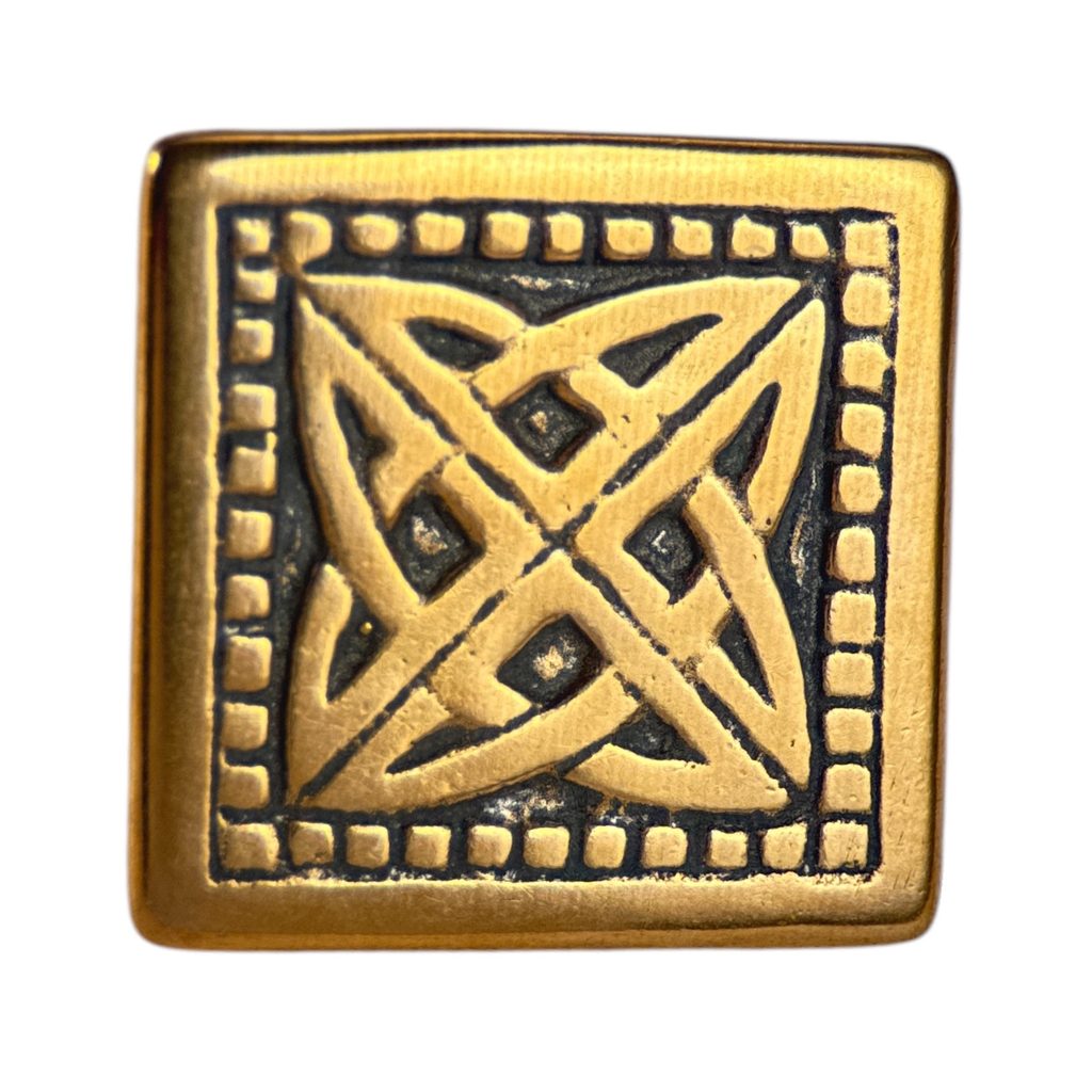 Bronzový keltský opaskový nýtek zobrazující kříž složený ze čtyř triquet. Motiv pochází ze?12. století z Irska, Glendalough.