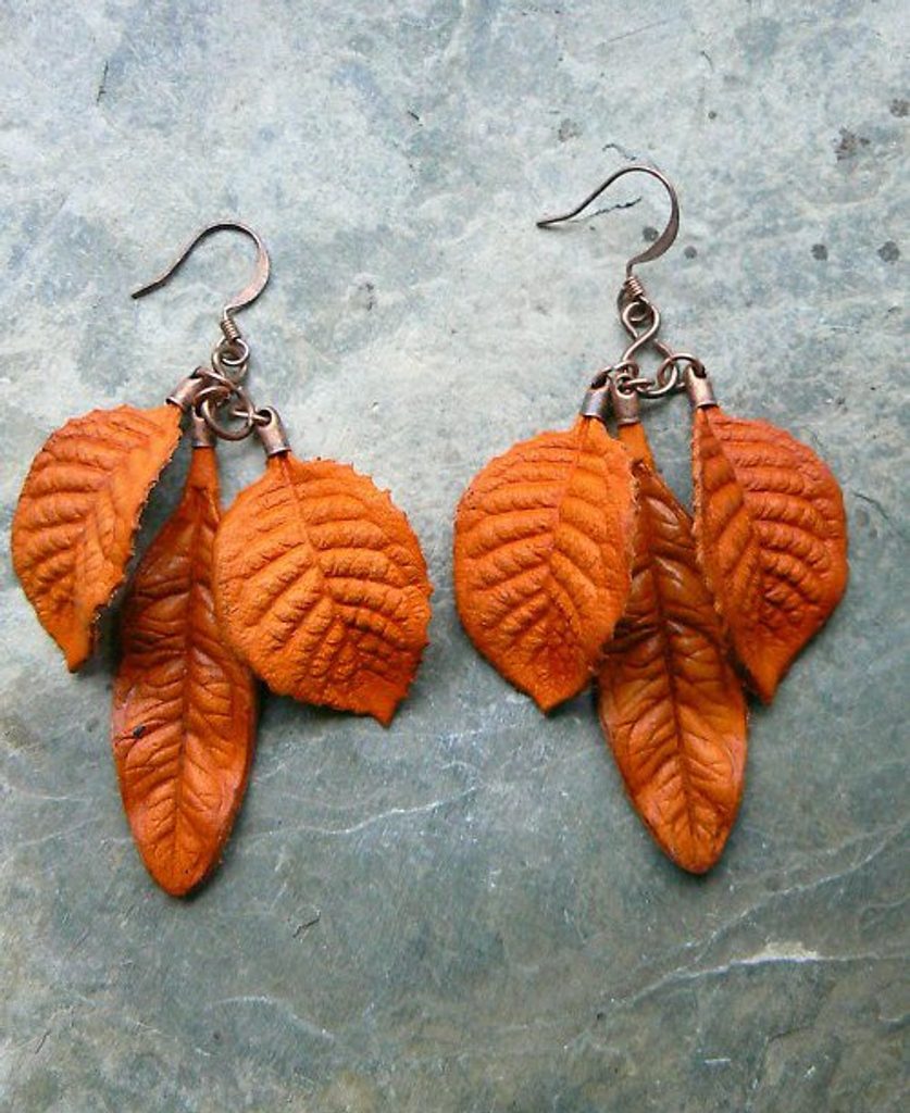 Ručně vyráběné kožené náušnice barvené na oranžovo. Původně vysekávací formy pro tyto listy byly součástí cca 100 let starého stroje pro výrobu klobouků, nyní našly uplatnění ve šperkařství. Ojedinělý šperkařský počin.