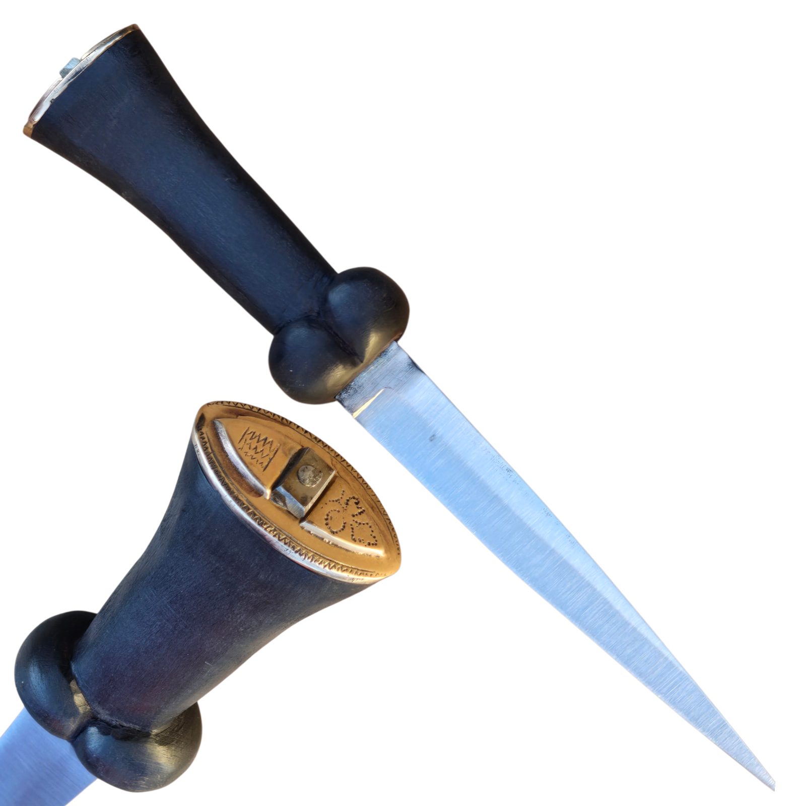 Věrohodná replika ledvinové dýky, též známé jako dýka falická originál pochází z Čech. Udělali jsme z bronzu přesou kopii vršku s erbovními motivy. Dýka nemá ostrou čepel (1.5 - 2 mm), aby nedošlo k pořezání, špička je do ostra a lze ji oupit. Přesto dýka neslouží k tréningu.