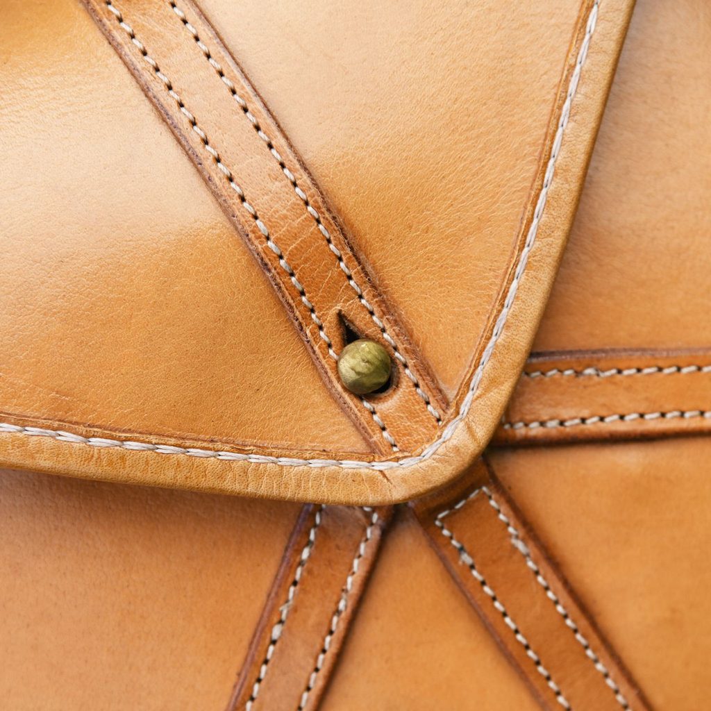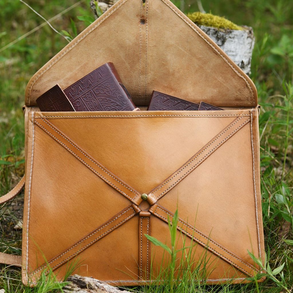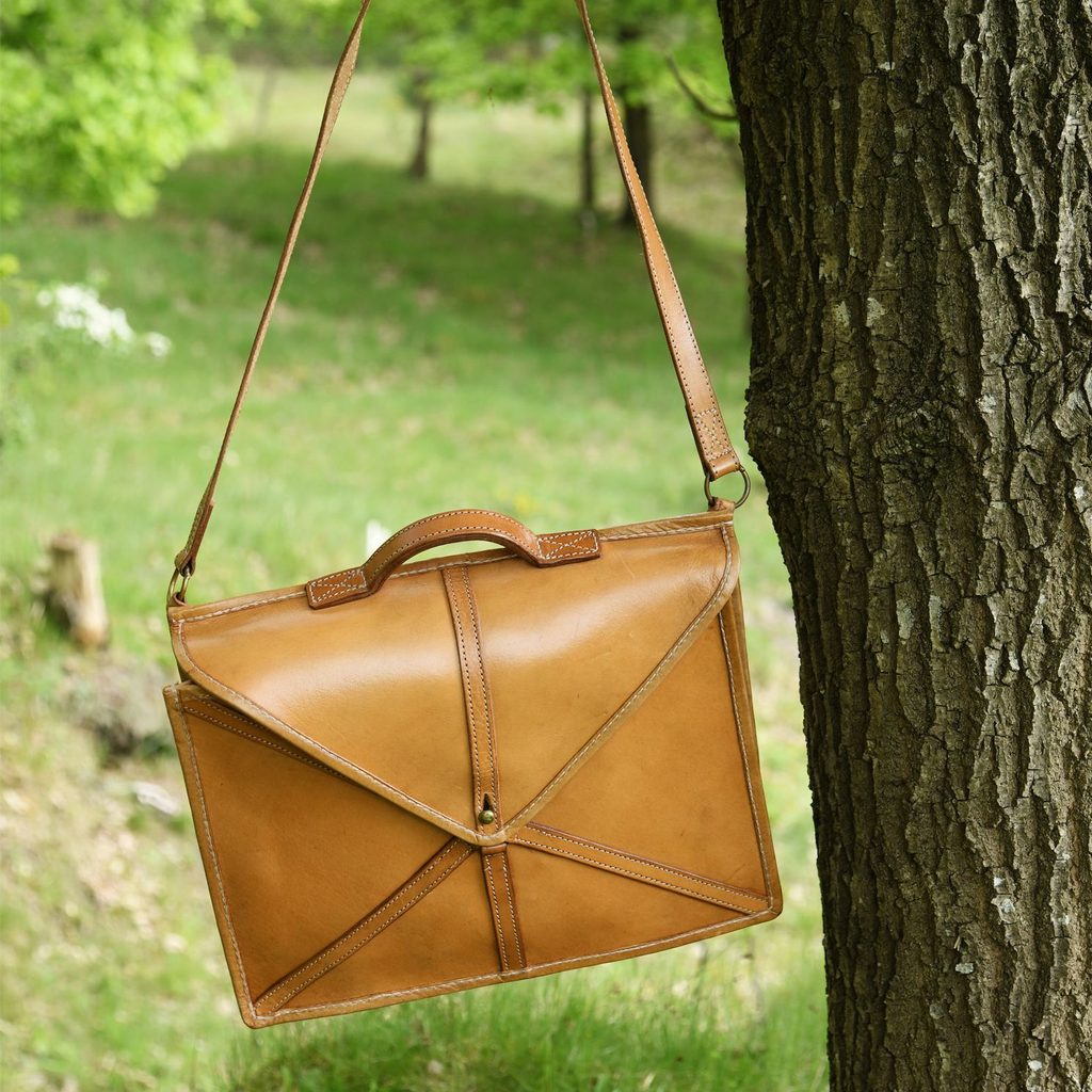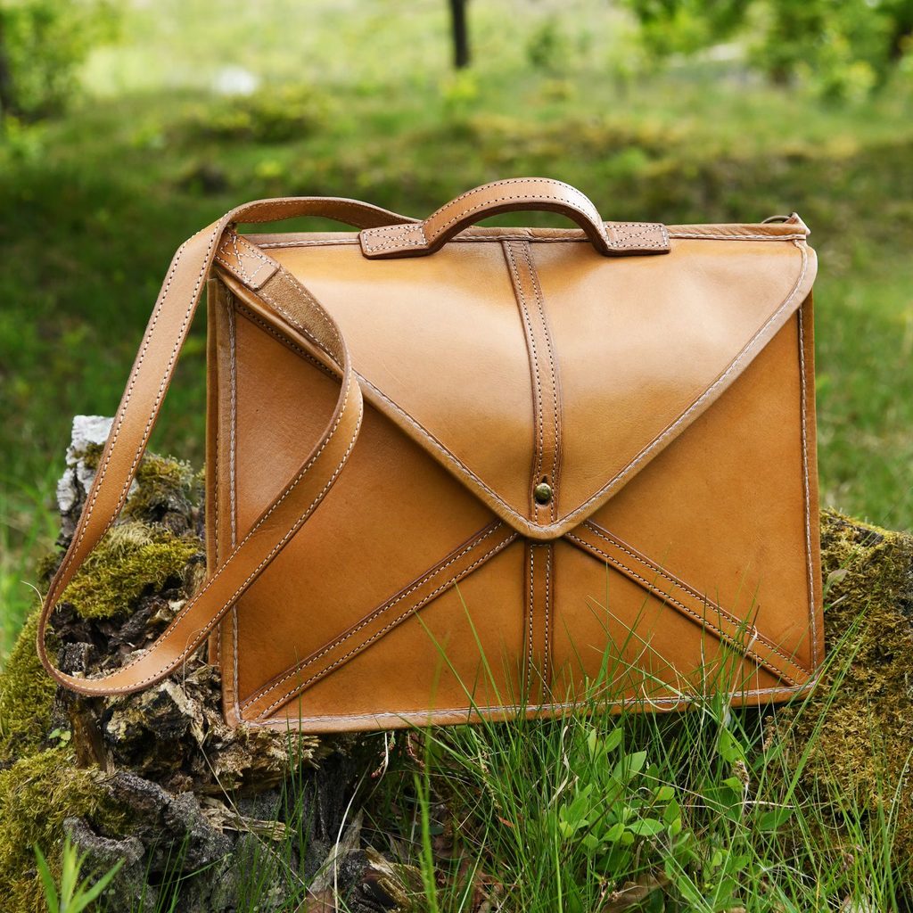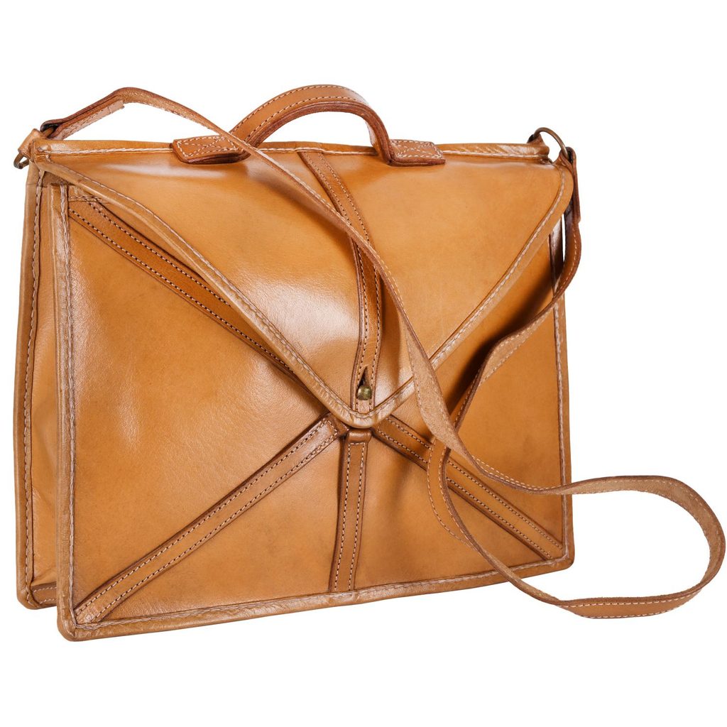 Taška je vyrobena z hovězí kůže a má nosné držadlo a ramenní popruh.