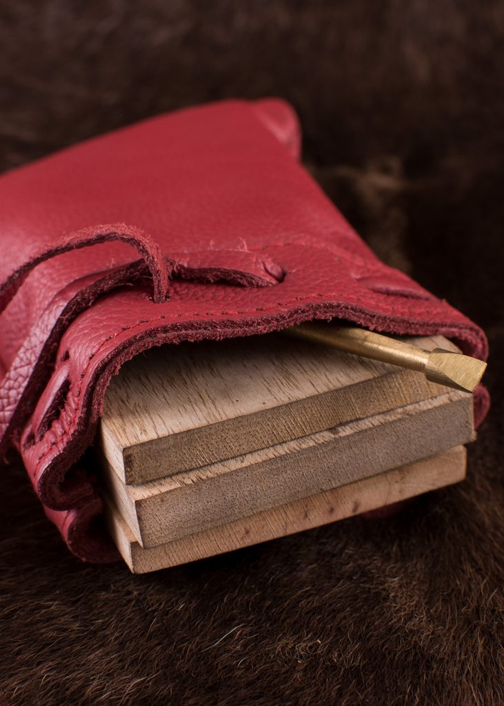 Středověká vosková kniha, Dyptichon. Tento set obsahuje dřevěnou voskovou knihu (čtyři prázdné panely), mosazné pero (stylus) a kožený váček. Plochý konec pera slouží k vymazávání záznamů ve vosku.