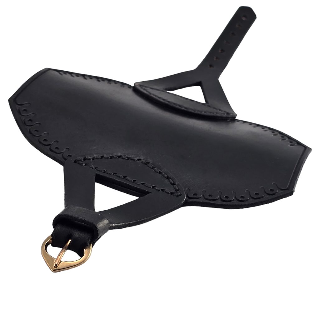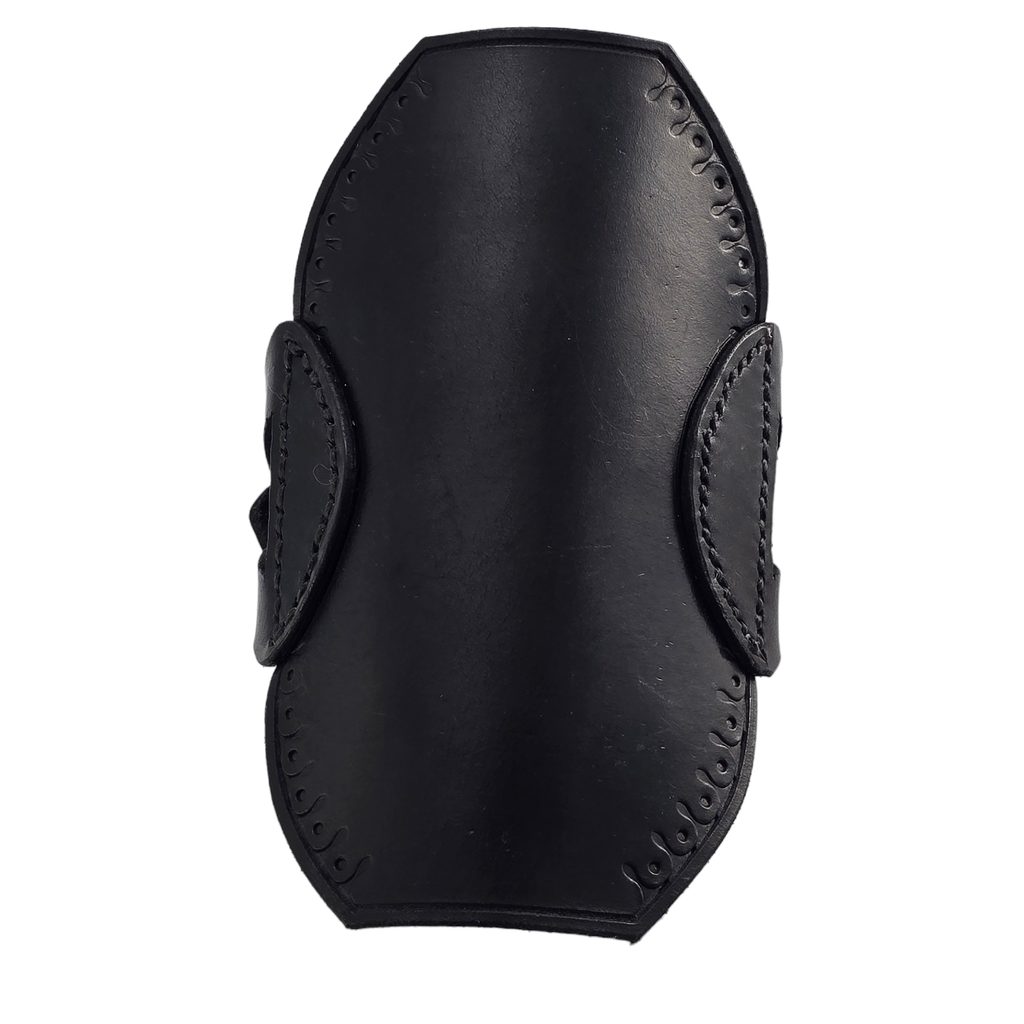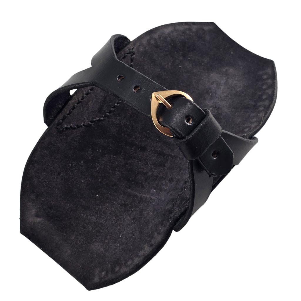 Chránič předloktí pro lučištníka. Pro lučištníka se jednalo téměř o nezbytnost, pokud nechtěl mít předloktí odřené od dopadají tětivy. Kožené chrániče jako je tento se používaly napříč celým středověkem a v Anglii, kde mělo lučištnictví hlubokou tradici, se tak dělo ještě v 16. století. Jejich tvary se prakticky neměnily a můžeme je najít na různých dobových vyobrazeních lučištníků napříč středověkem. S ohledem na vkus toho kterého období se mohla měnit nanejvýše spona.