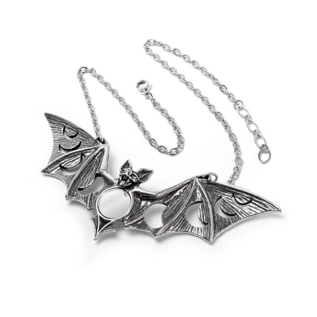 Náhrdelník ve tvaru netopýra s výřezy fází měsíce a centrálním vsazeným zrcadlovým prvkem.