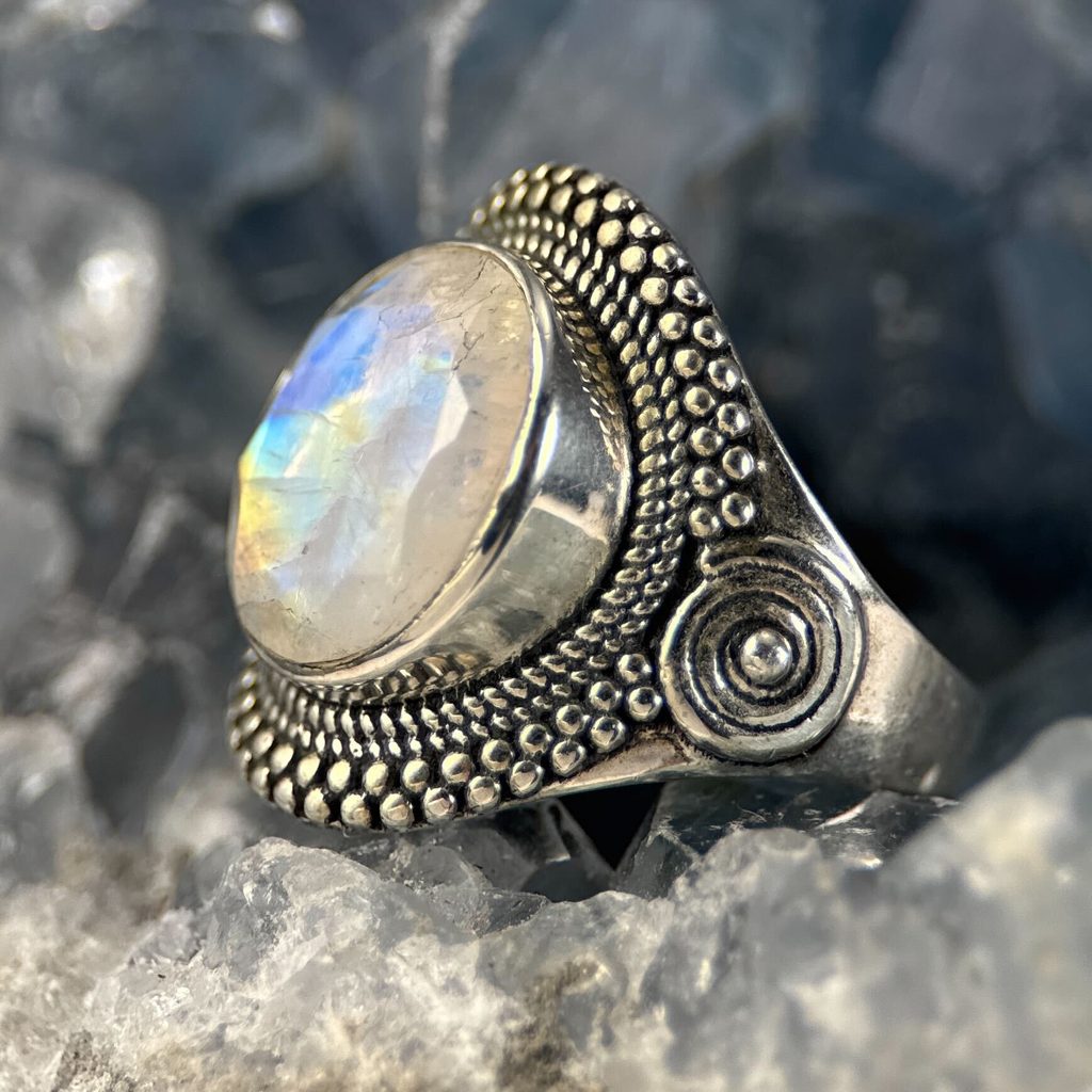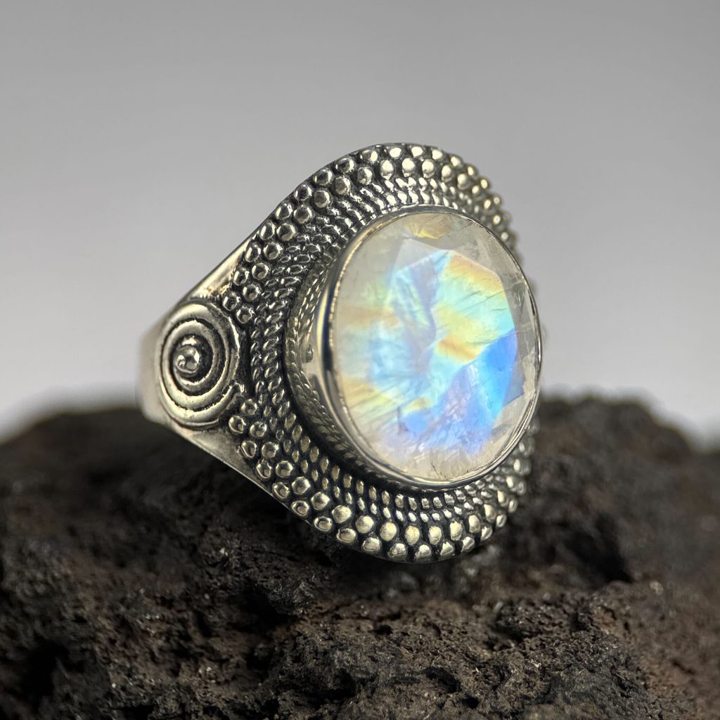 Stříbrný prsten s přírodním měsíčním duhovým kamenem – jemný nebesky blyštivý šperk pro ženy.
