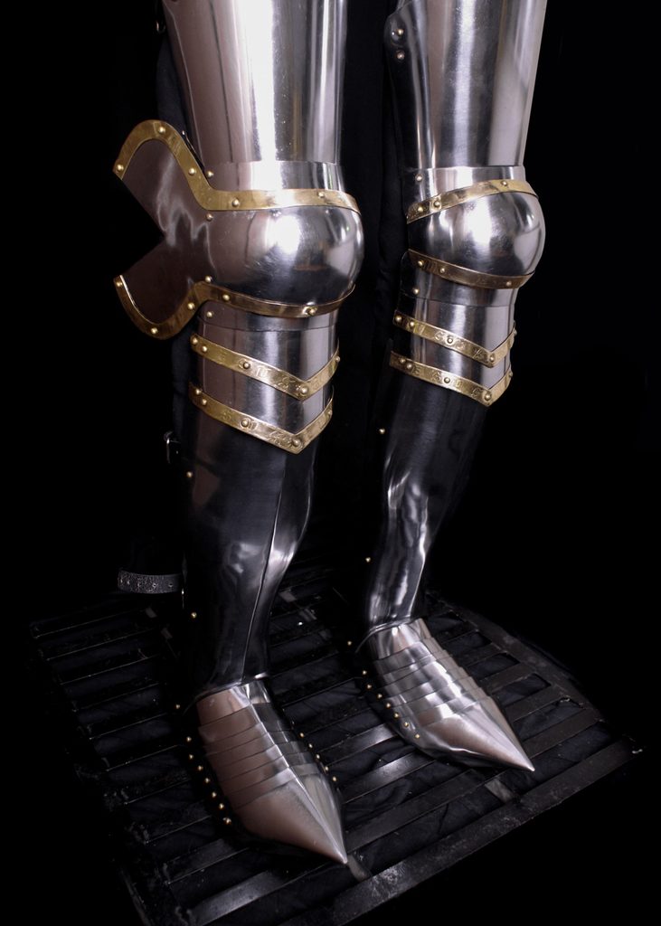 Dva kompletní díly ochrany nohou, zahrnující stehenní pláty, kolenní chrániče, holeně a sabatony (žehličky).