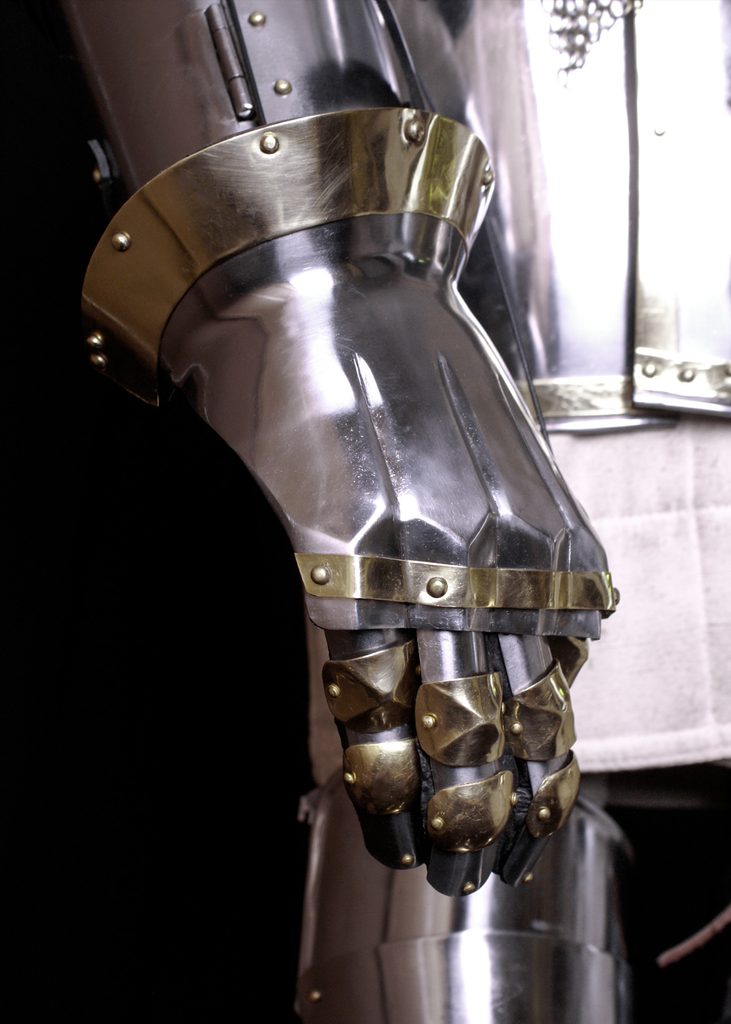 Ve středověku byla plátová zbroj samozřejmě zpravidla zhotovována na míru. My však nabízíme standardní velikost vhodnou pro muže průměrné postavy a výšky přibližně 175–180 cm. Na všech důležitých částech jsou přinýtovány nastavitelné kožené řemínky s přezkami, takže je možné určité přizpůsobení velikosti. Zejména hrudní plát nabízí díky svému skládacímu mechanismu výrazně lepší možnosti nastavení než jiné modely. Přesto bychom rádi upozornili, že u takové zbroje nelze očekávat stoprocentně přesné padnutí.