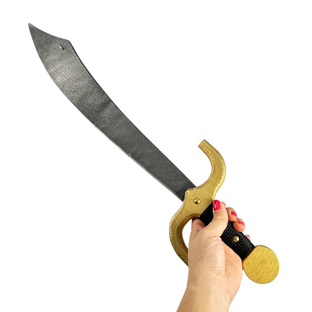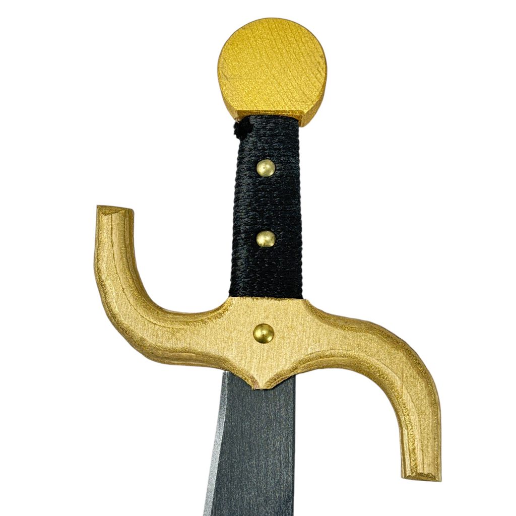 Dětská šavle o délce 55 cm z lipového dřeva, která v sobě nese ducha pirátských dobrodružství na širém moři. Čepel je černá jako noc bez hvězd, připravená čelit každé výzvě a připomíná slavné korzáry, kteří kdysi brázdili oceány. Zlatá záštita a hlavice dodávají šavli lesk kořisti z dávných námořních bitev, zatímco černá omotávka, zdobená zlatými nýtky, pevně sedí v ruce každého malého piráta. Tato šavle je připomínkou zlaté éry pirátství, kdy odvaha a dobrodružství čekaly za každým obzorem.