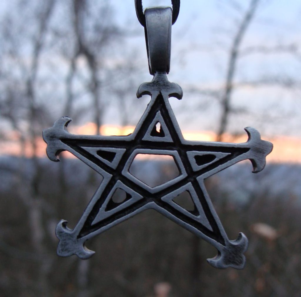 PENTAGRAM, talisman. Přívěšek je opatřen tenkou vrstvou pryskyřice, která do velké míry brání oxidování kovové složky amuletu.