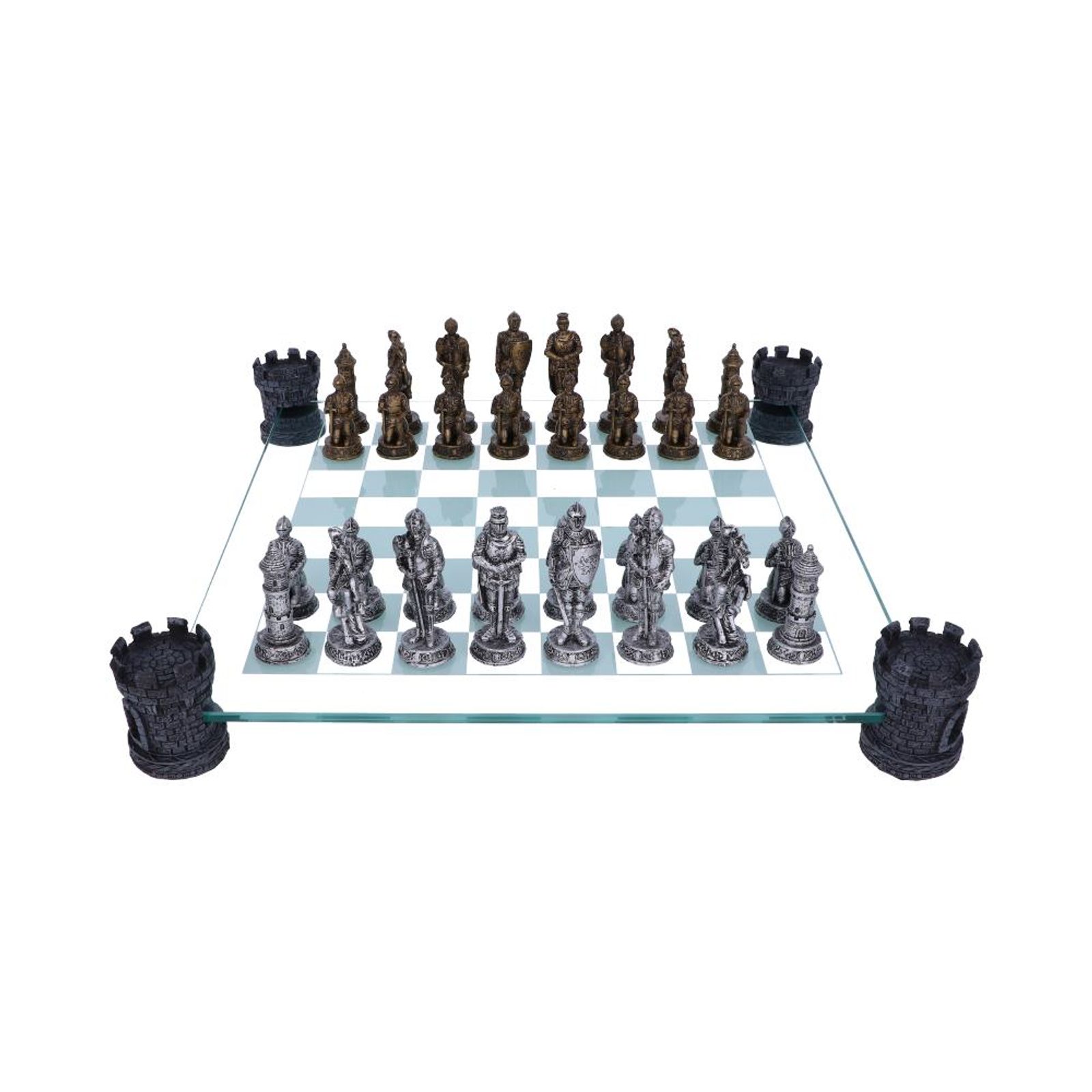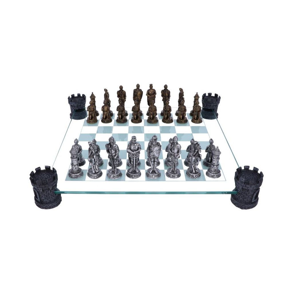 Skleněná šachovnice spočívá na čtyřech robustních černých věžích připomínajících středověkou architekturu. Okraje hrací desky zdobí ornamentální motivy s keltskými a gotickými prvky, které podtrhují historický charakter celé sady. Figurky představují dvě proti sobě stojící armády rytířů.