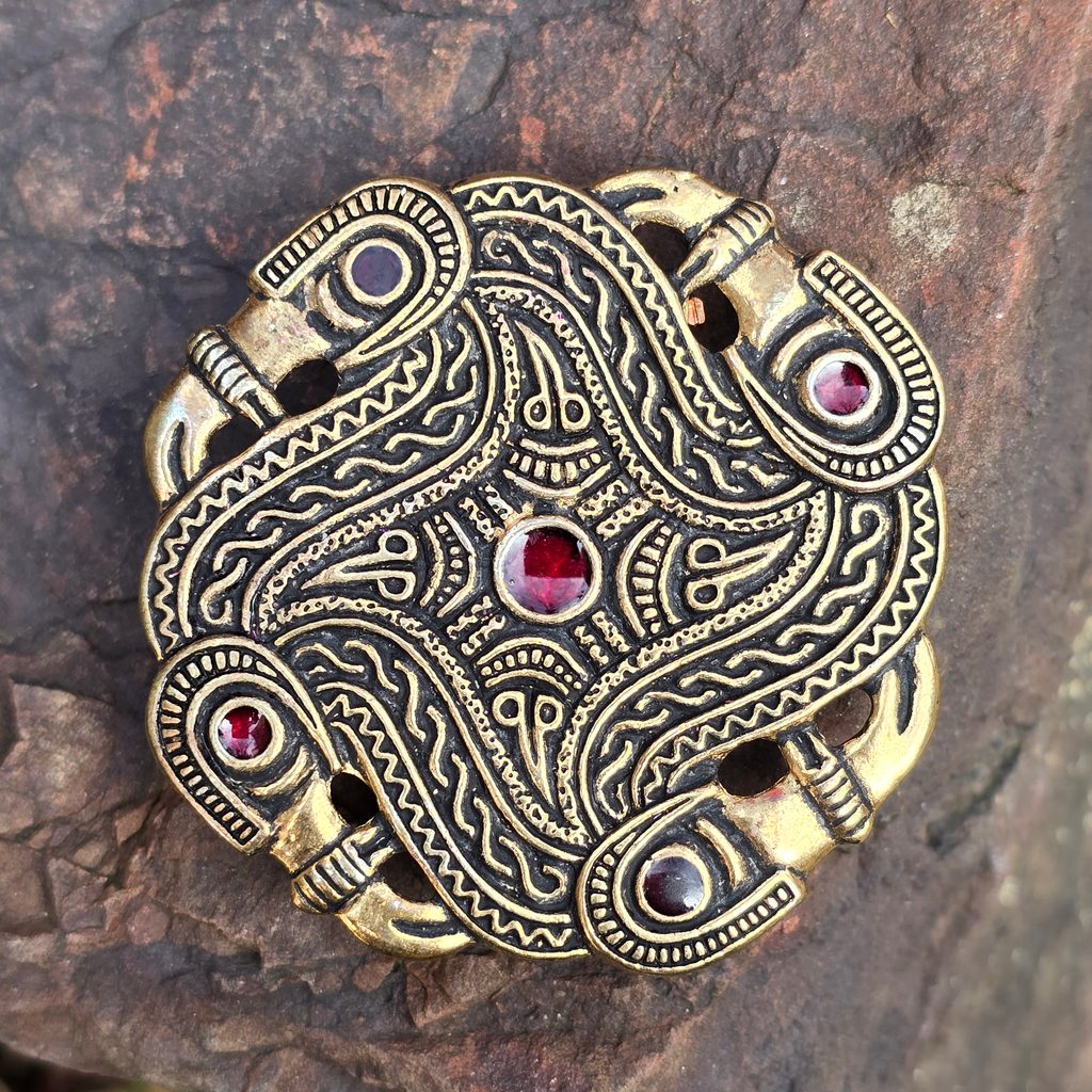 Na výzdobě byly čtyři vířící se hlavy dravců hledící doleva s očima z granátových intarzií, lemované čtyřmi krky zdobenými spletenými pásy. Od 5. do počátku 7. století byly diskové brože kombinované s broží charakteristickou součástí oděvu.