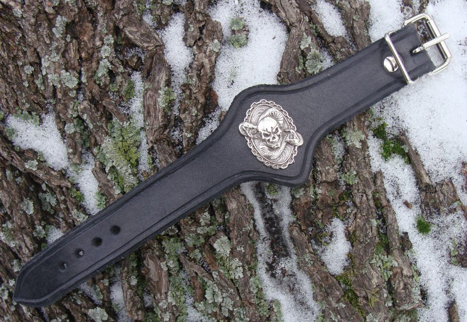 Metalový kožený náramek je vyroben z velmi kvalitní silné hověziny se zapracovaným motivem - LEBKA S HADY (začerněno, nikl). Velikost náramku cca 4 x 26 cm, nastavitelná délka.