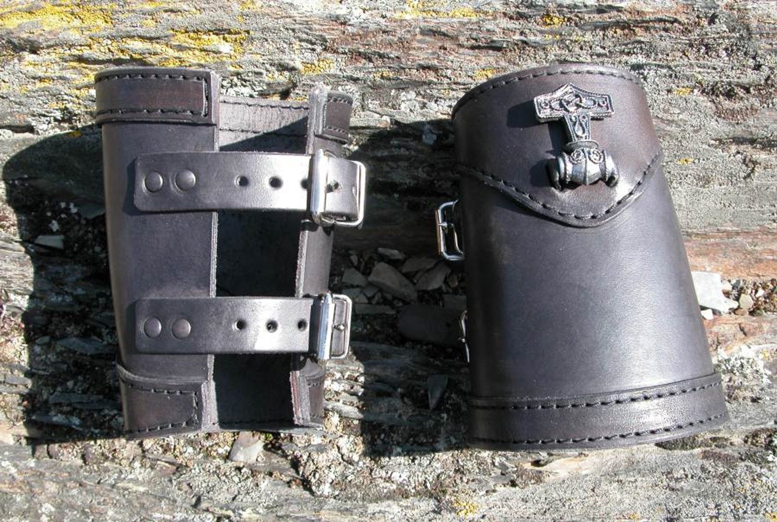 Sevřená pěst a Thorův Božský atribut - Thorovo kladivo - mají něco do sebe. Nátepníky jsou velmi pevné, ručně šité, lemy zesíleny další vrstvou kůže, místo šněrování je užito řemínků a přezek. Design Drakkaria.