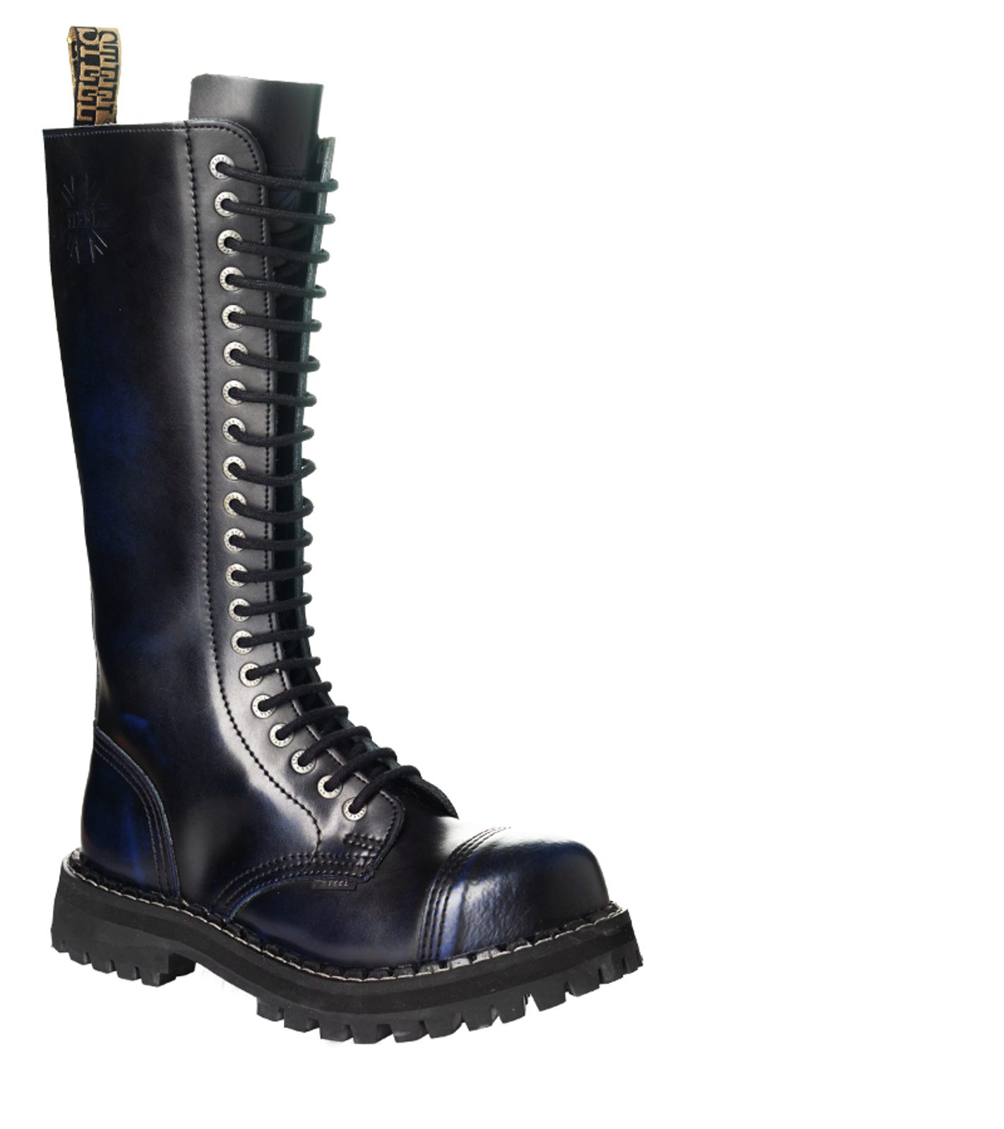 Boty STEEL 20 dírkové. Stylové boty z hovězí kůže. Celokožené s ocelovou špičkou a trojitými švy. Podrážka je vyrobena z klasické tvrzené gumy s traktorovým vzorem a ozdobnými šrouby, také plíškem s nápisem Steel.