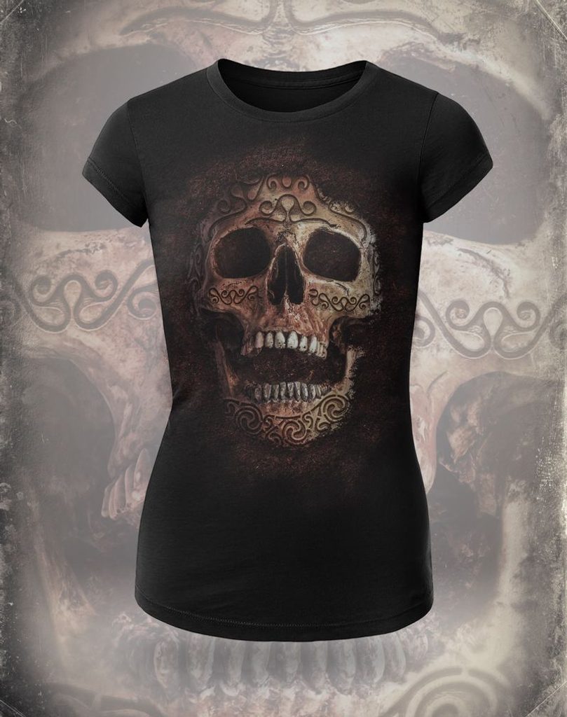 Keltské tričko s lebkou. Hlava jakožto symbol byl u Keltů velmi oblíben. Staří Keltové si dokonce hlavy nepřátel brávali do svých příbytků - věřili, že jim dává sílu.