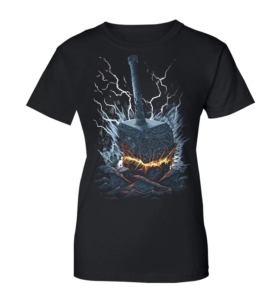 Barevné DÁMSKÉ tričko Mjöllnir drtí skálu v severním ledovém oceánu. Špičkový design naší vlastní značky Naav fashion. Thorovo kladivo, neboli Mjöllnir, je zbraň patřící bohu stejného jména. Jako závěs na krku ho nosili zejména severští válečníci a mořeplavci - Vikingové. Thórovo kladivo je nerozbitné, vždy trefí svůj cíl a poté se navrátí do ruky svému majiteli. Toto kladivo létá po obloze ve formě blesku. Mjöllnir znamená v překladu „drtič”. Thór jej nepoužíval jenom k zabíjení obrů, nýbrž s ním mohl oživovat své kouzelné kozly, žehnal s ním k sňatkům, nebo oral pole. Aby Thor touto strašlivou zbraní mohl bezpečně vládnout, nosí kovové rukavice a opasek, který zdesetinásobuje jeho sílu.