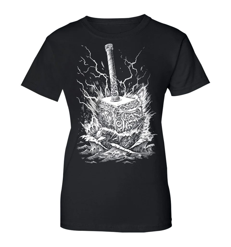 Dámské tričko s magickou zbraní Severského Boha. Špičkový design naší vlastní značky Naav fashion. Thorovo kladivo, neboli Mjöllnir, je zbraň patřící bohu stejného jména. Jako závěs na krku ho nosili zejména severští válečníci a mořeplavci - Vikingové. Thórovo kladivo je nerozbitné, vždy trefí svůj cíl a poté se navrátí do ruky svému majiteli. Toto kladivo létá po obloze ve formě blesku. Mjöllnir znamená v překladu „drtič”. Thór jej nepoužíval jenom k zabíjení obrů, nýbrž s ním mohl oživovat své kouzelné kozly, žehnal s ním k sňatkům, nebo oral pole. Aby Thor touto strašlivou zbraní mohl bezpečně vládnout, nosí kovové rukavice a opasek, který zdesetinásobuje jeho sílu.