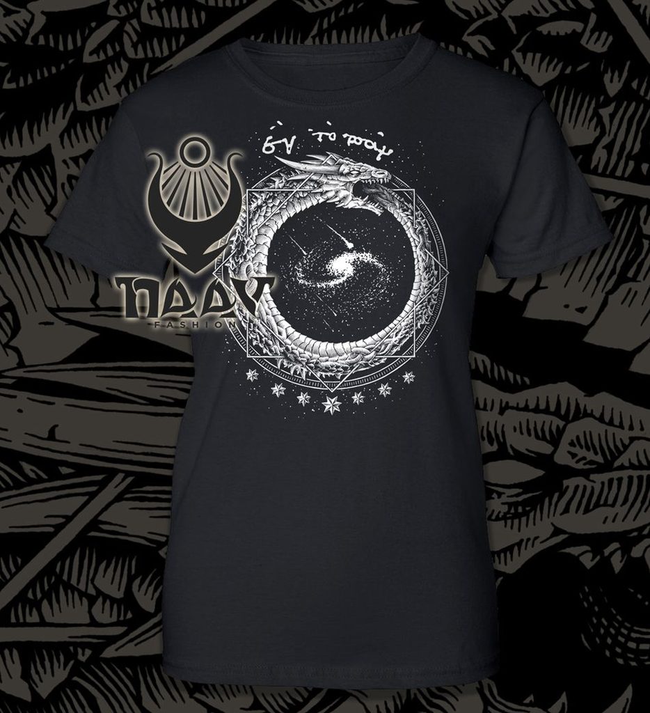 Nápis na tomto tričku je řecký ἓν τὸ πᾶν ("Vše Jedno jest") z díla Cleopatra the Alchemist, MS Marciana gr. Z. 299. (X. století)
