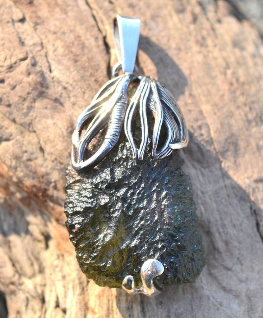 Surový jihočeský vltavín jako stříbrný přívěšek. Váš šperk se bude trochu lišit od vyobrazeného přívěšku ve tvaru a velikosti. Na Vaši žádost Vám před odesláním pošleme foto skladových kusů k Vašemu výběru.