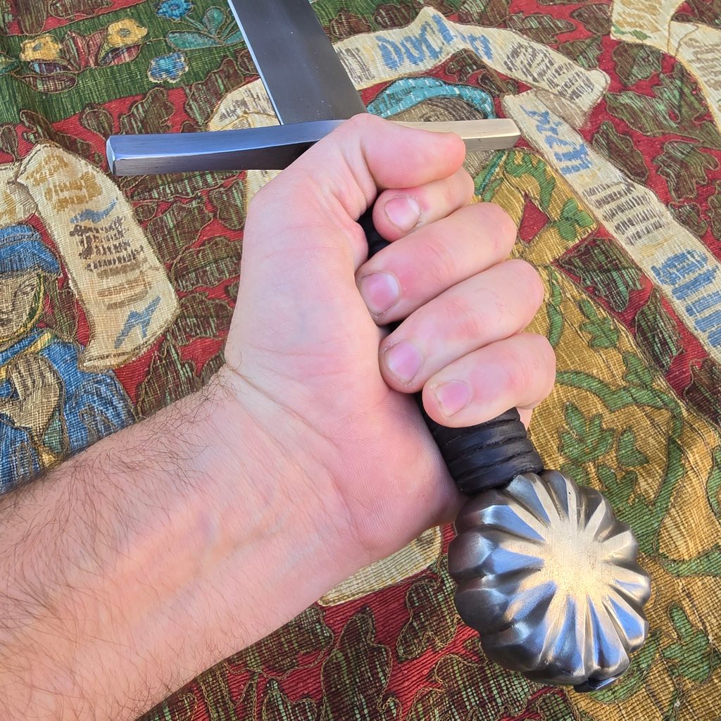 Jednoruční středověký meč z naší kovářské dílny. Konstrukčně i řemeslně velmi povedený meč v provedení full-tang. Celá čepel je vyrobena v jednom kuse, skrz hlavici meče, kde je čepel zanýtována. V tomto tupém provedení je meč určen ke scénickému šermu.