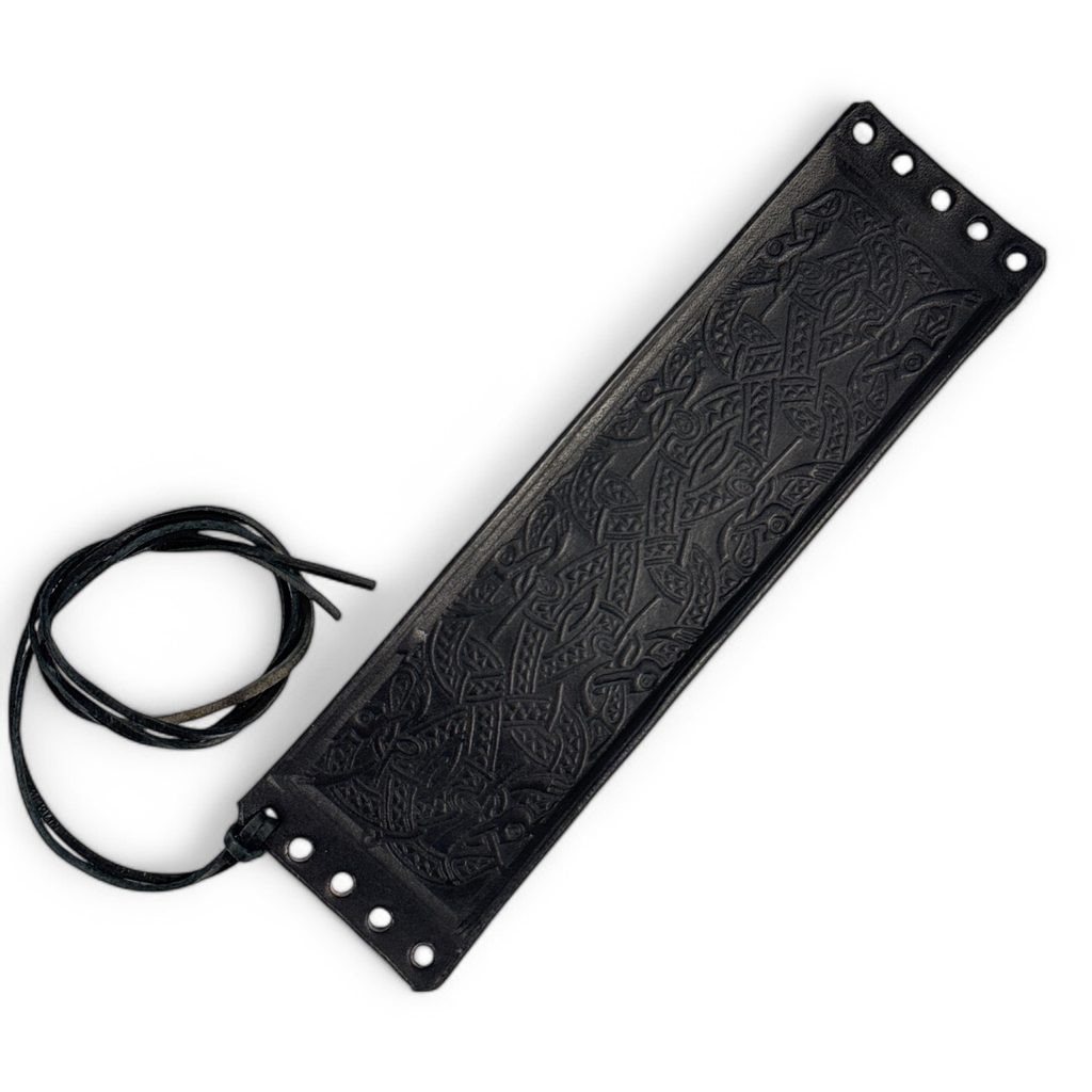 Vkingský motiv, na němž je znázorněno cosi, co připomíná draky, případně mořské nestvůry (podobné motivy jako na brakteátech - mincích. Náramek je vyroben z pevné kvalitní hlazené hověziny, je ražený.