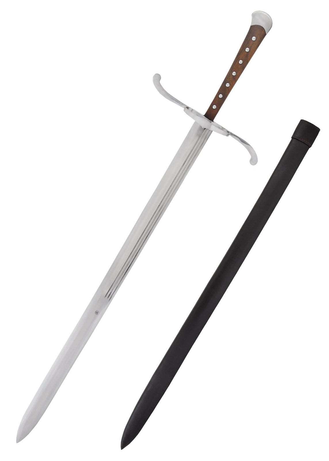 Kovaná záštita má esovitě zakřivený tvar a na lícové straně je opatřena velkým prstencem. Robustní trn je nýtován do masivní, z jednoho kusu kované ocelové hlavice. Střenky rukojeti z tvrdého dřeva jsou připevněny pomocí sedmi železných nýtů s kulovitou hlavou. Horní polovina čepele je zdobena třemi žlábky. Čepel je ručně kovaná z pružinové oceli EN45 a olejově kalená na tvrdost přibližně 48–50 HRC. Ostří však není nabroušeno.