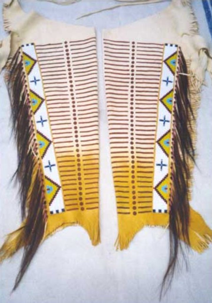 Indiánské leginy, zdobené vyšívanými pásy, „skalpy“ z koňských žíní a malováním. Pruhy symbolizují počet bitev, kterých se nositel zúčastnil.