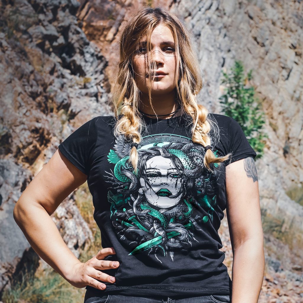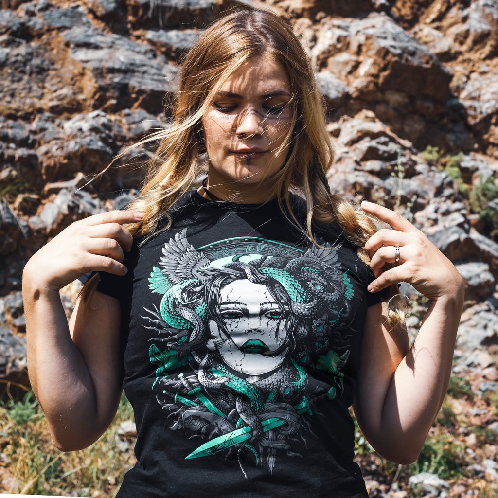 Medusa, tričko inspirované antickou řeckou mytologií. Medusa byla jediná smrtelná z trojice Gorgon, dcer Boha Forkýna a jeho manželky Kéty. Později ji zabil Perseus, zaútočil na ni s okřídlenými sandály a kouzelnou přilbu, která ho učinila neviditelným. Na Medusu zaútočil z výšky, díval se na ni svým štítem, který nastavil jako zrcadlo. Pak a usekl jí hlavu.