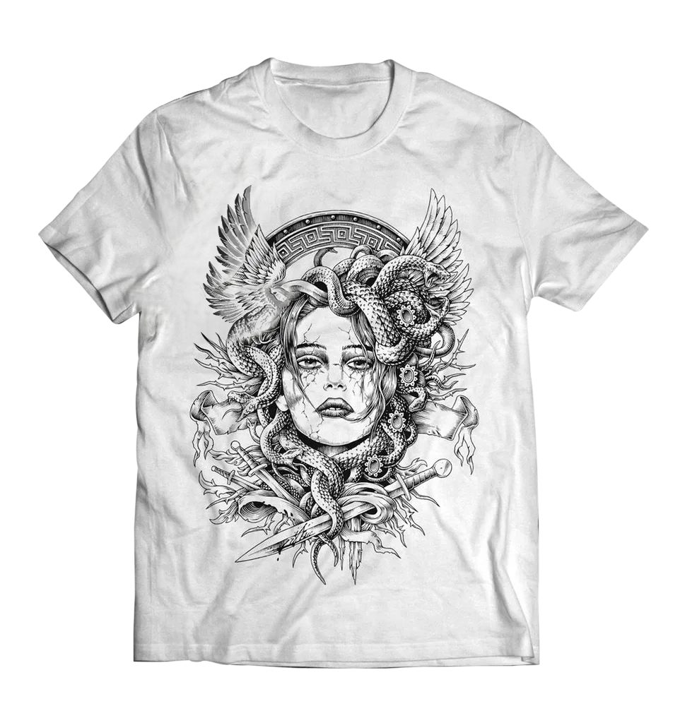 Medusa, tričko inspirované antickou řeckou mytologií. Medusa byla jediná smrtelná z trojice Gorgon, dcer Boha Forkýna a jeho manželky Kéty. Později ji zabil Perseus, zaútočil na ni s okřídlenými sandály a kouzelnou přilbu, která ho učinila neviditelným. Na Medusu zaútočil z výšky, díval se na ni svým štítem, který nastavil jako zrcadlo. Pak a usekl jí hlavu.