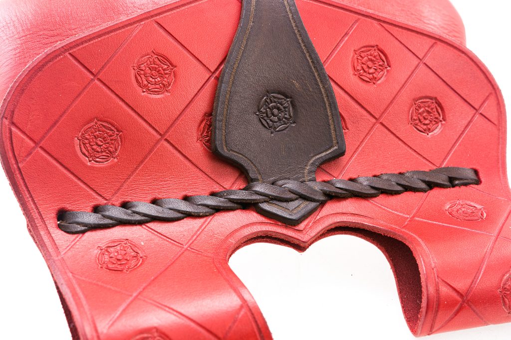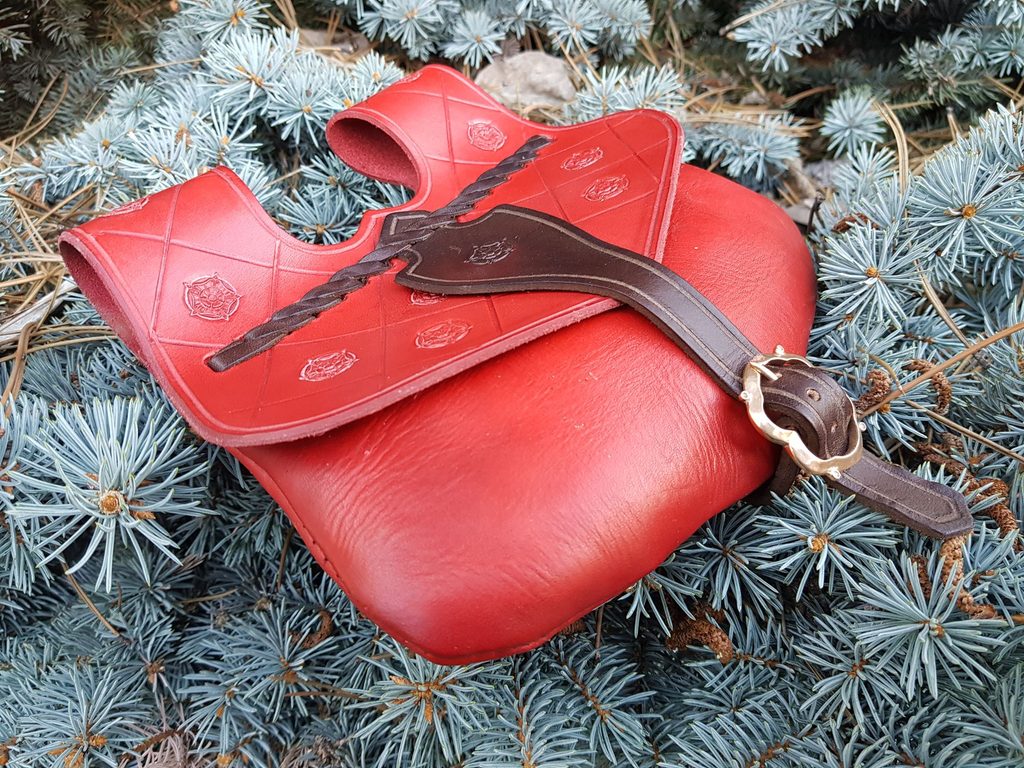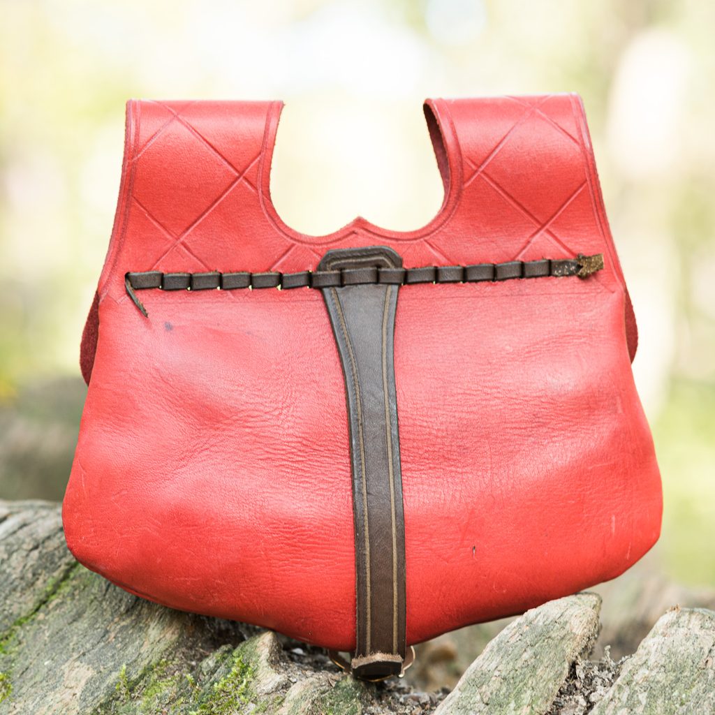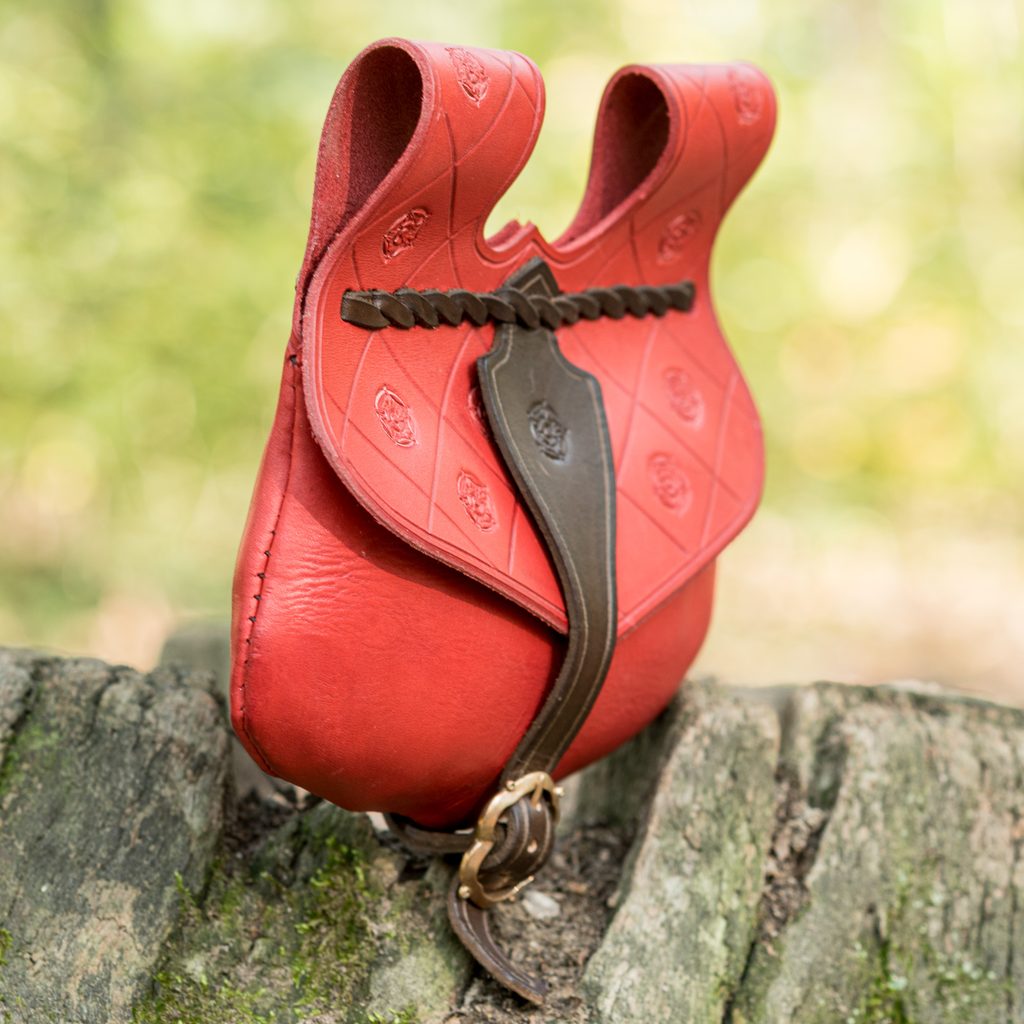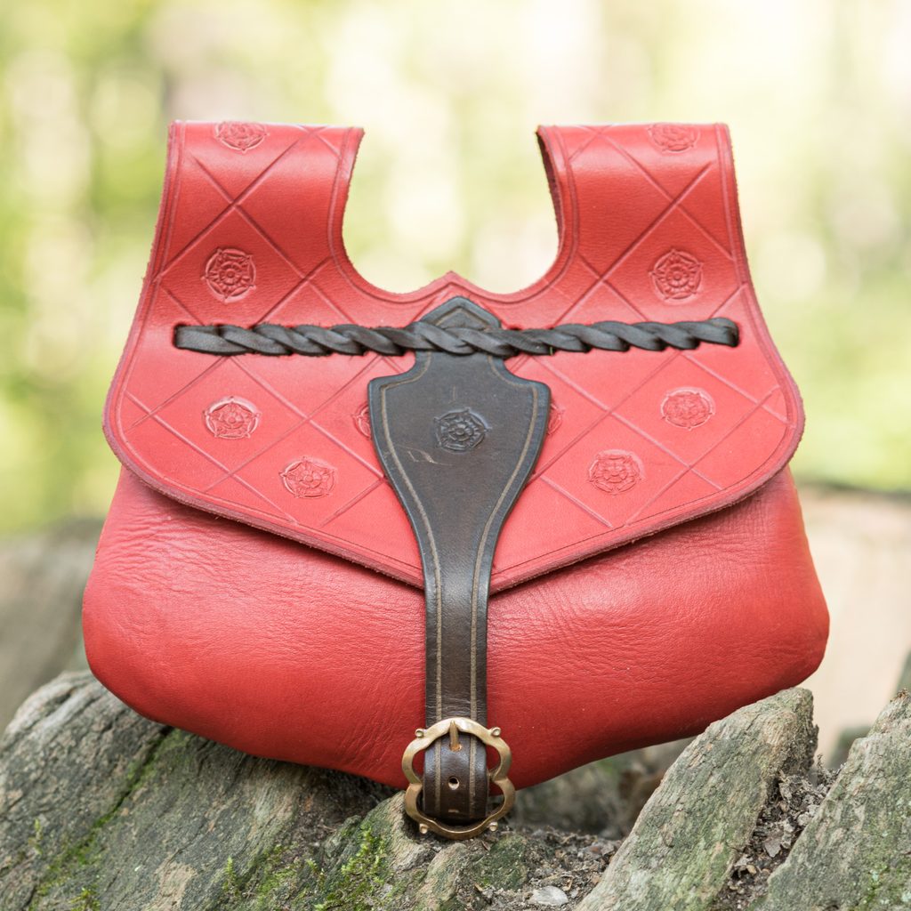Ručně vyrobená kožená středověká brašna s vyraženou růží. Vnitřní systém obsahuje dvě úložné vrstvy. Ruční malování.
