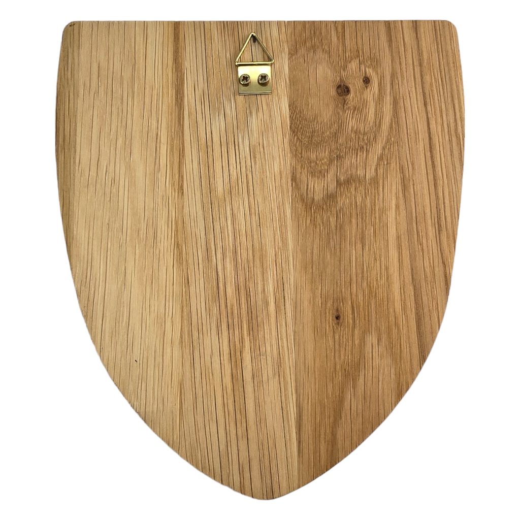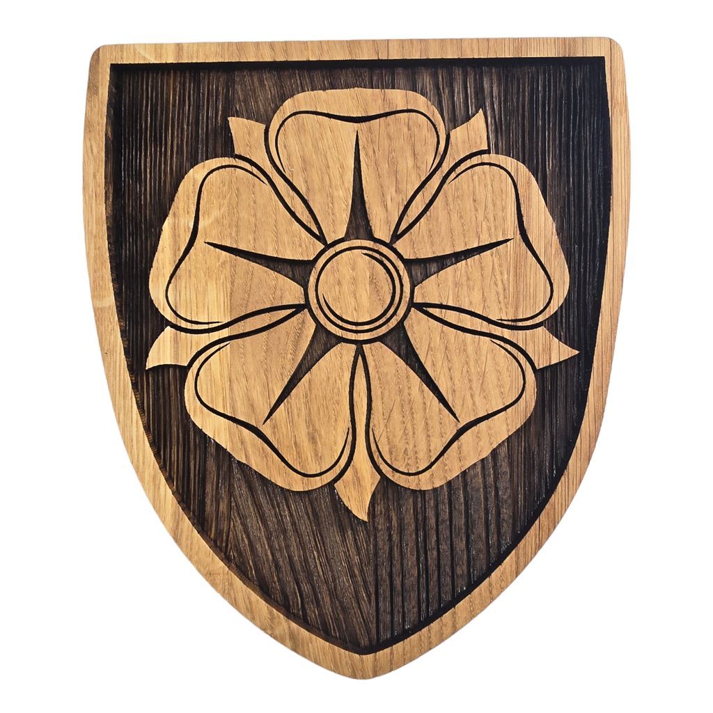Pětilistá růže je vypálena do dubového dřeva, které je ošetřeno olejem a celý erbovní znak slouží jako dekorace na zeď.