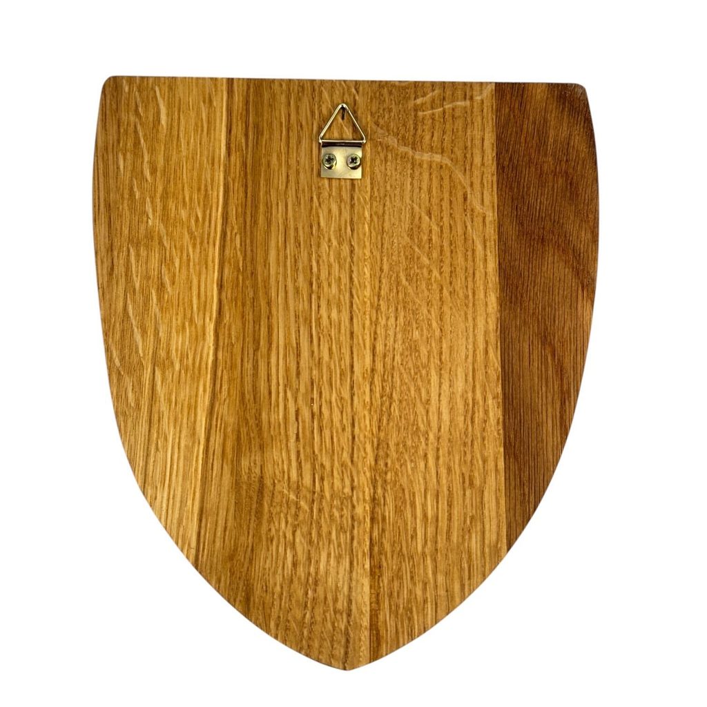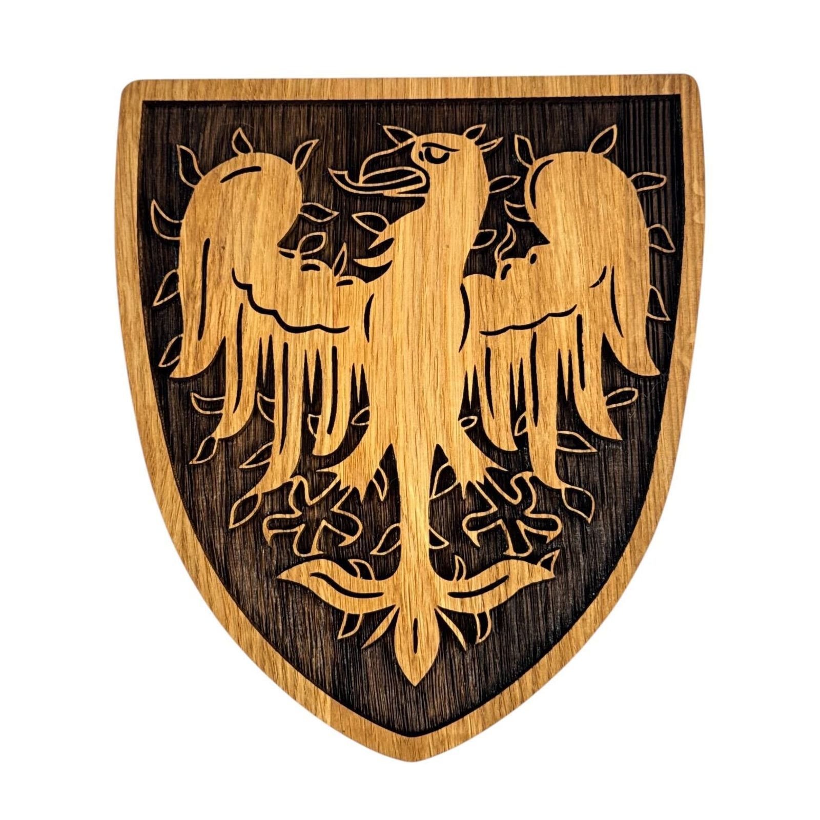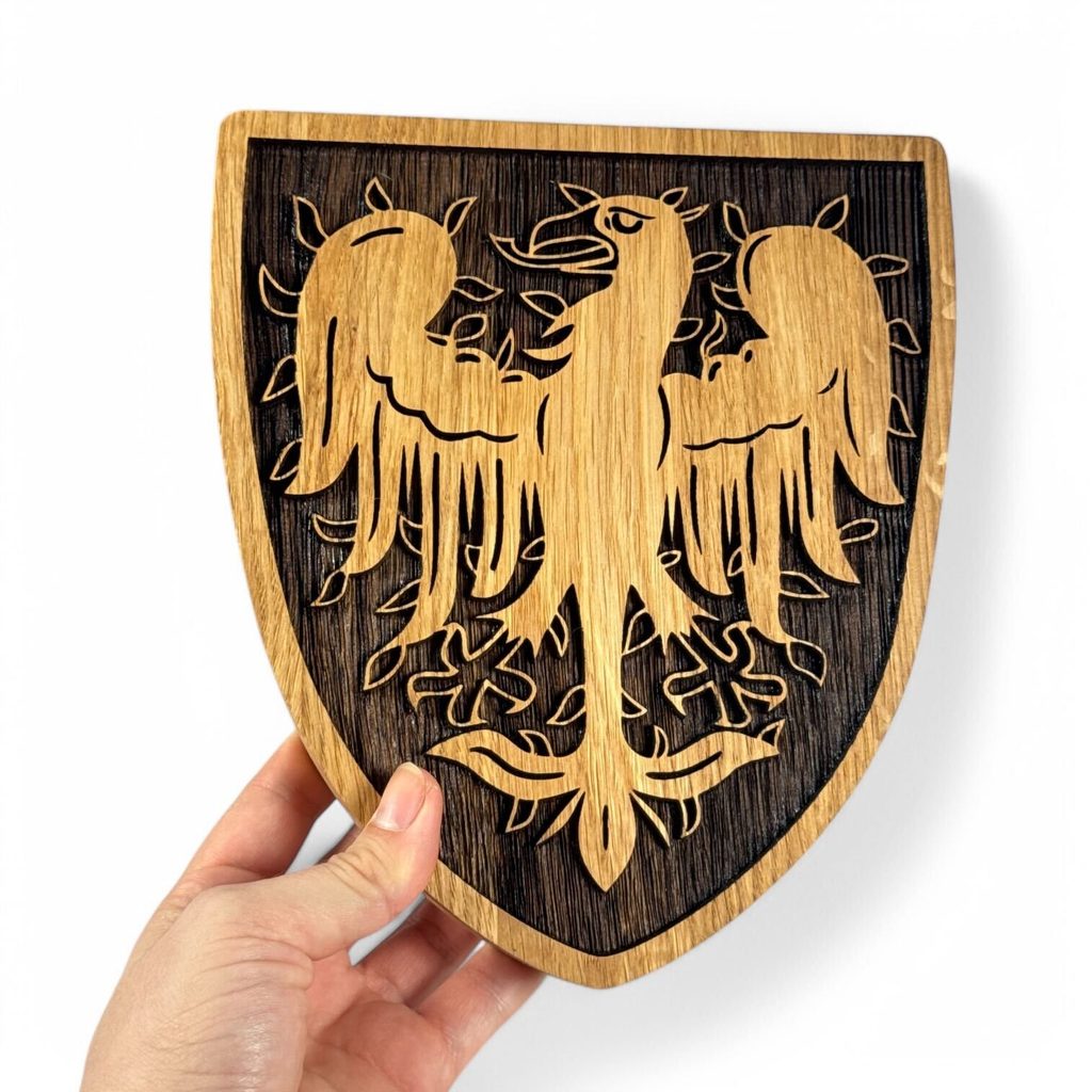 Plamenná orlice je vypálena do dubového dřeva, které je ošetřeno olejem a celý erbovní znak slouží jako dekorace na zeď.